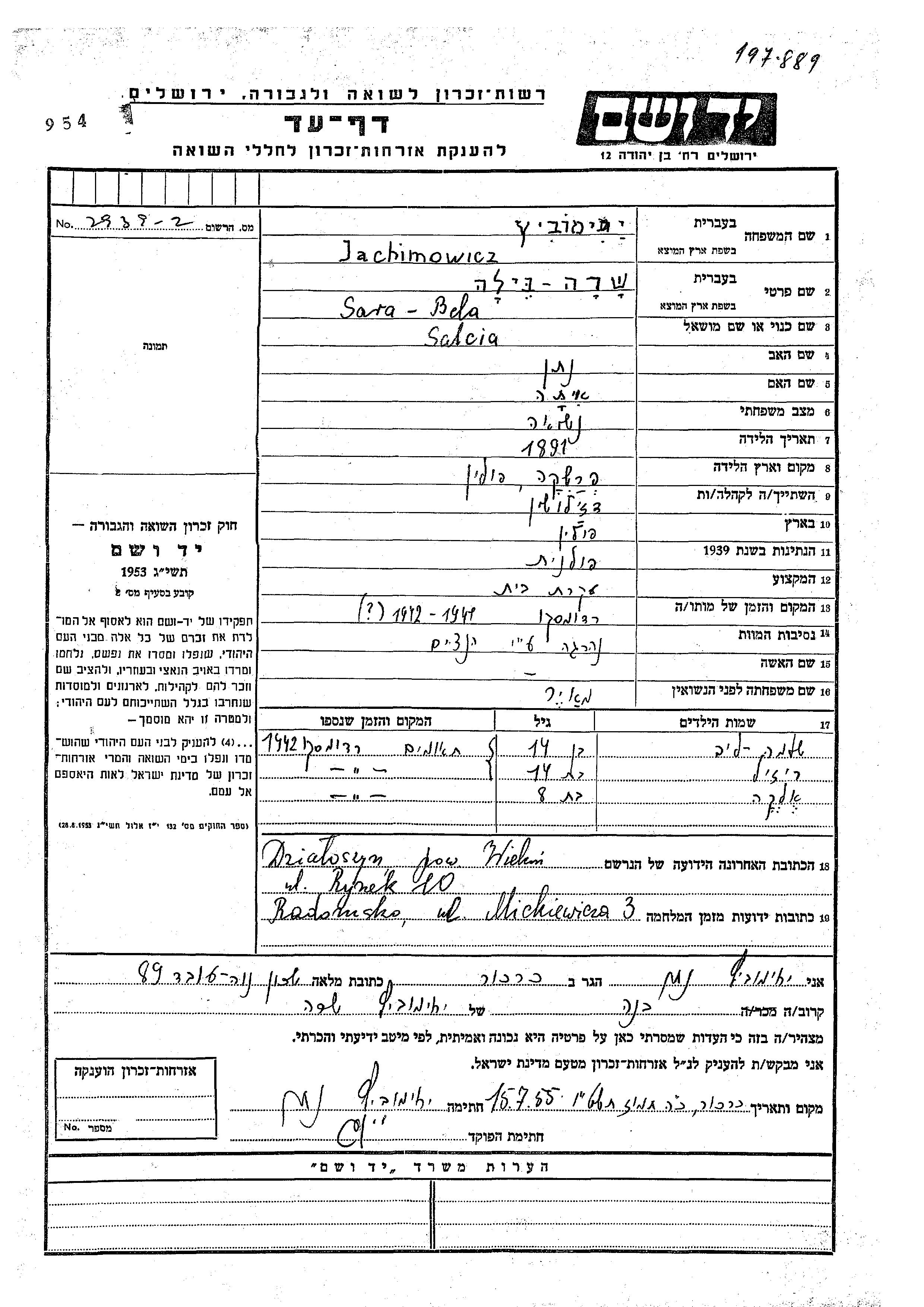 Jachimowicz Sara Bila 1891 Dzialoszyn, Polen Gedenkblatt