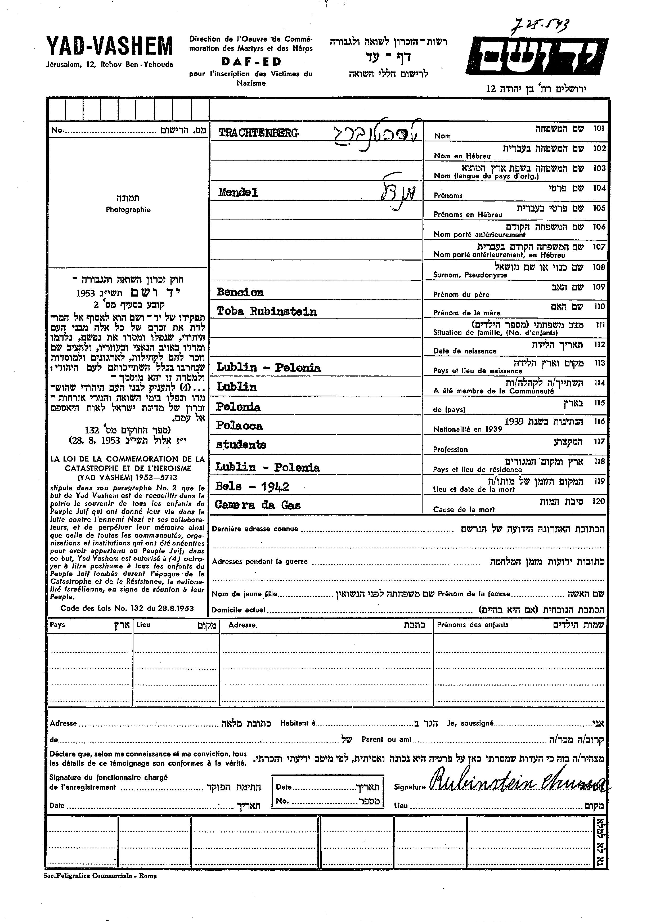 Mendel Trachtenberg wurde in Lublin, Polen geboren. Er war der Sohn von Bencion und Toba. Er war Student. Vor dem Zweiten Weltkrieg lebte er in Lublin, Polen.