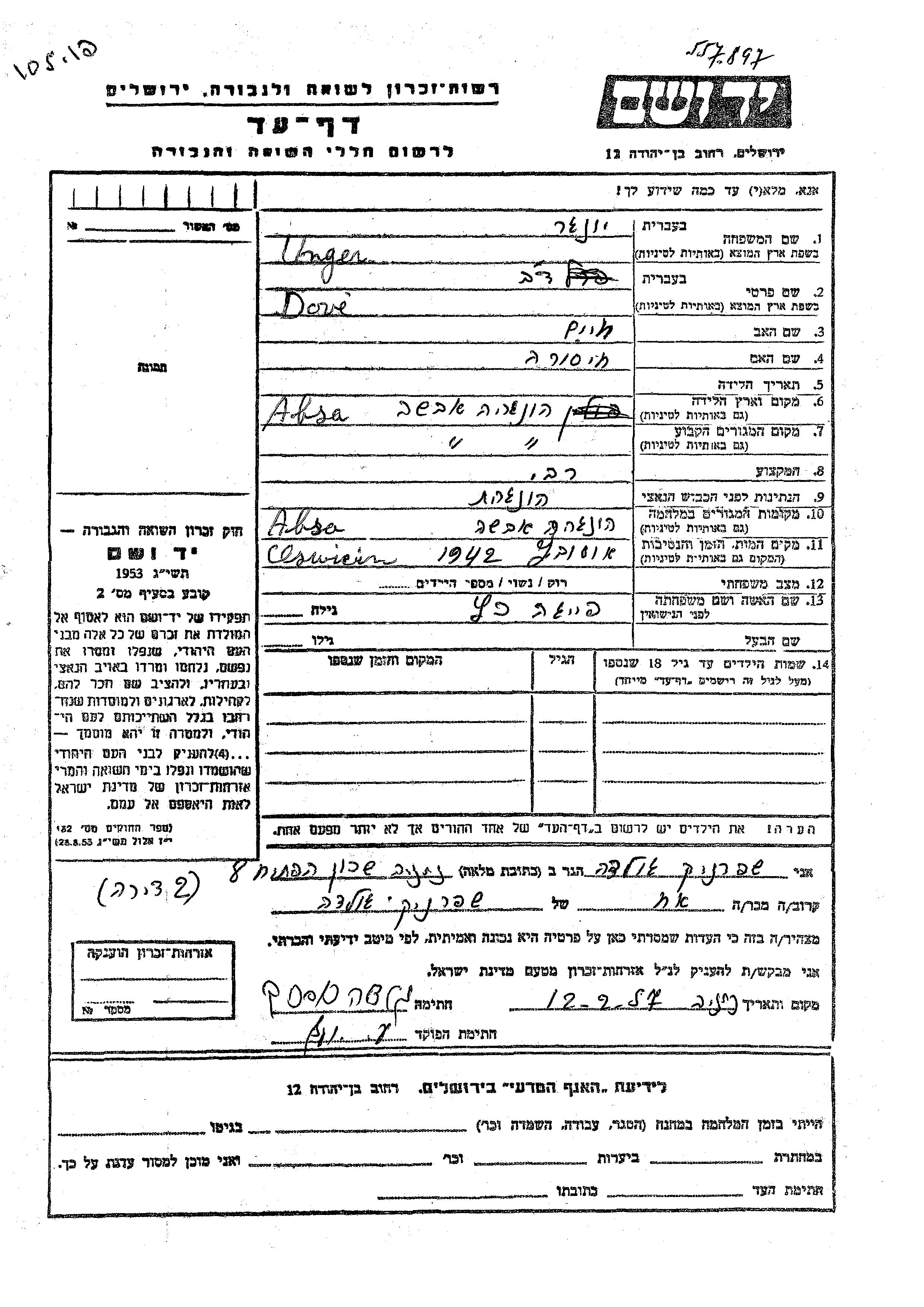 Dove Unger Iunger wurde in Ungarn geboren. Er war der Sohn von Khaim und Khaisora. Er war Rabbiner. Vor dem Zweiten Weltkrieg lebte er in Ungarn. Während des Krieges war er in Ungarn.