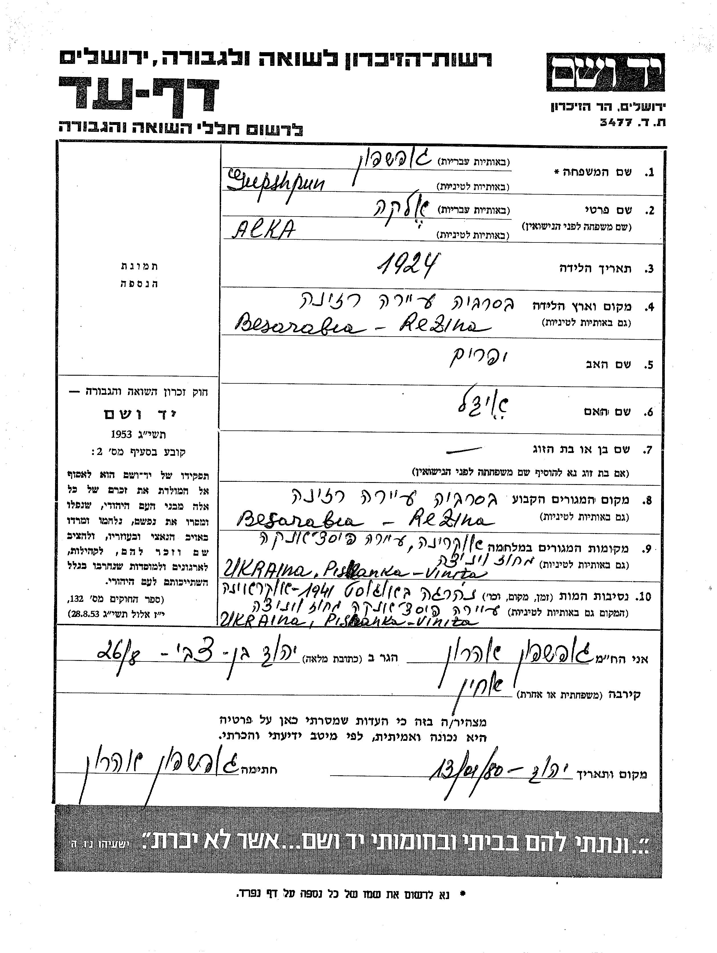 Alka Elka wurde in der Schoah ermordet. Todesort: Pishchanka, Ukraine (UdSSR) im Jahr 08/1941.