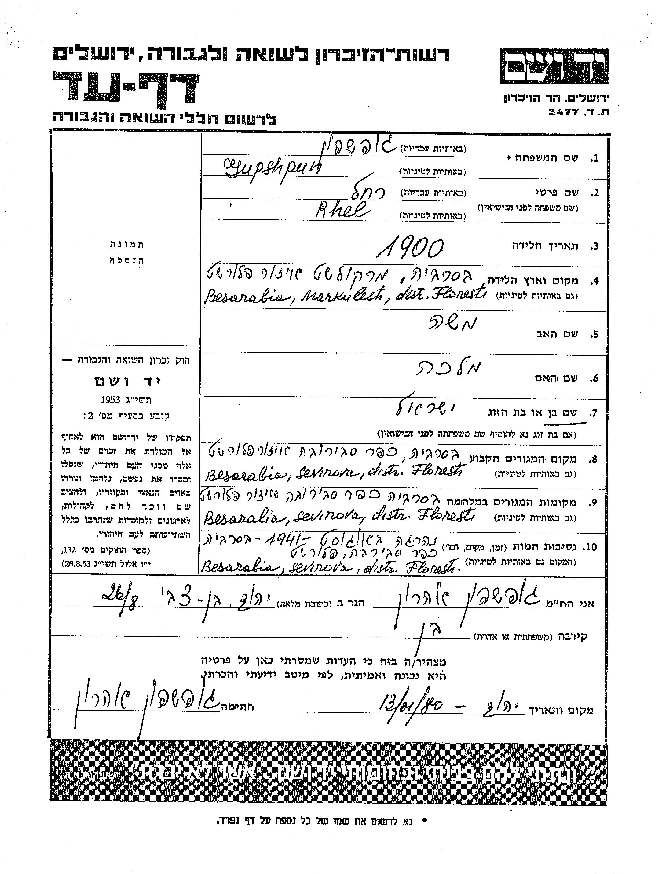 Rhel wurde in der Schoah ermordet. Todesort: Sevirova, Rumänien im Jahr 08/1941.