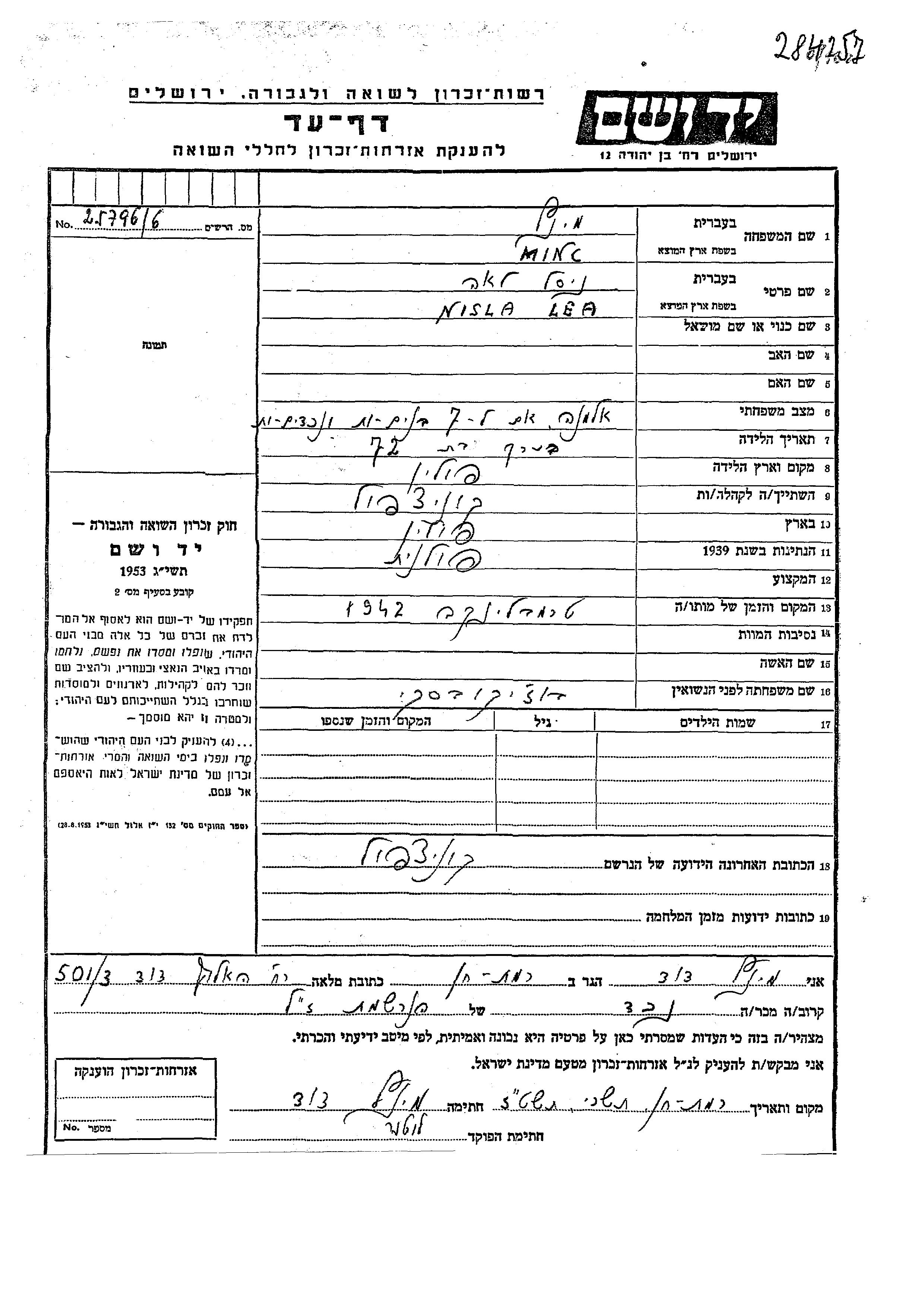 Nisla Lea wurde in der Schoah ermordet. Todesort: Treblinka, Polen im Jahr 1942.
