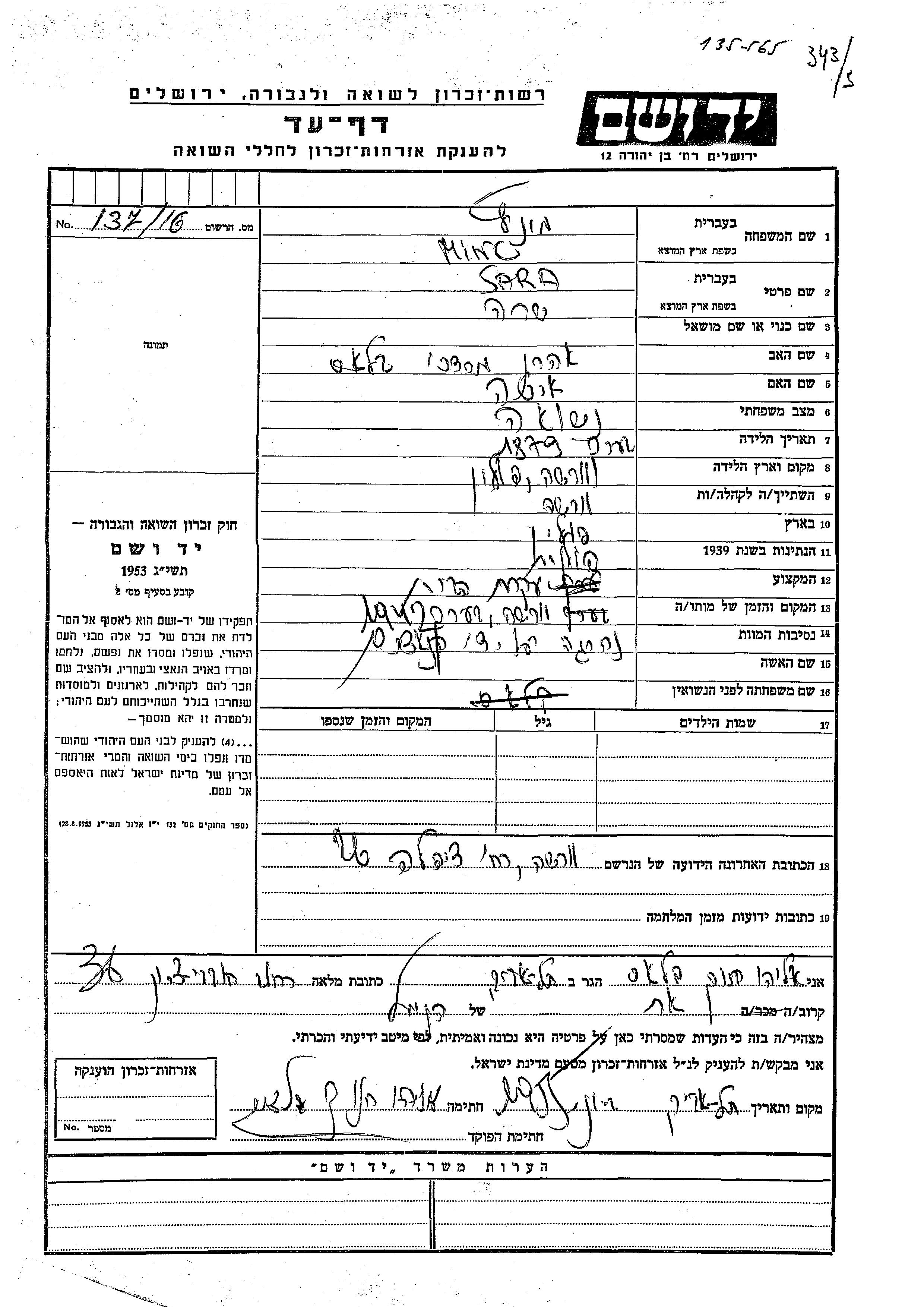 Sara Minc, geb. Blass wurde im Jahr 1879 in Warszawa, Polen geboren. Sie war die Tochter von Aharon Mordekhai und Ester Yeshayahu. Sie war Hausfrau und Verheiratet. Vor dem Zweiten Weltkrieg lebte sie in Warszawa, Polen. Während des Krieges war sie in Warszawa, Polen.