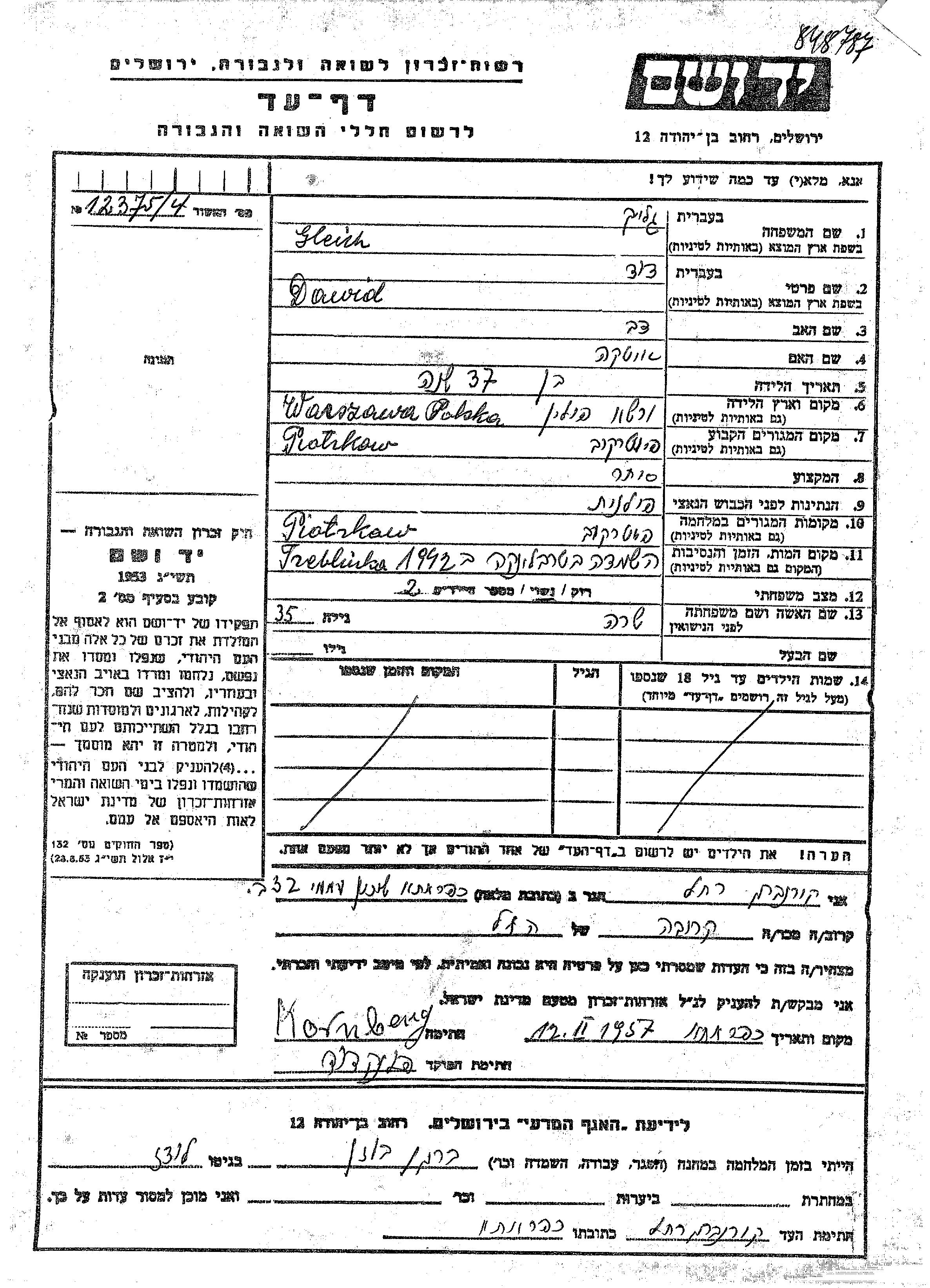Dawid Gleich wurde in Varsha, Polen geboren. Er war der Sohn von Dov und Itka. Er war Kaufmann/-frau und mit Sara Verheiratet. Vor dem Zweiten Weltkrieg lebte er in Piotrkow, Polen. Während des Krieges war er in Piotrkow, Polen.