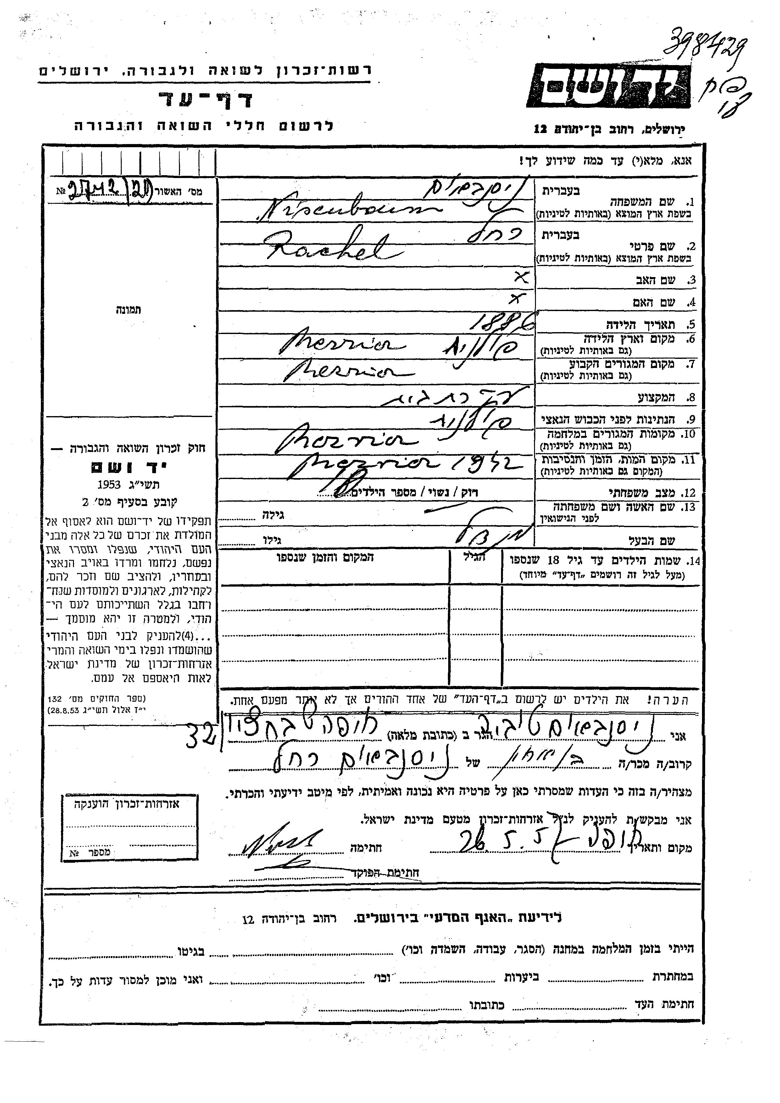 Rachel Nisenboum wurde im Jahr 1886 in Mezrich, Polen geboren. Sie war Hausfrau und mit Mendel Verheiratet. Vor dem Zweiten Weltkrieg lebte sie in Mezrich, Polen. Während des Krieges war sie in Mezrich, Polen.