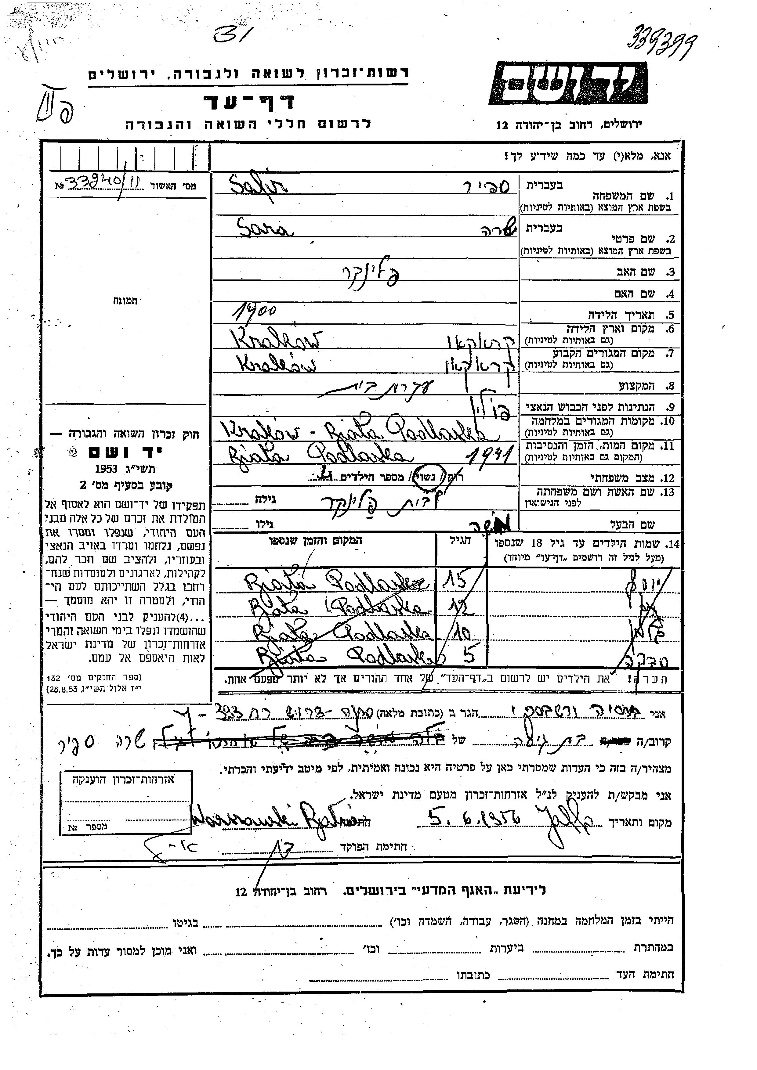 Sara Safir, geb. Palinker wurde im Jahr 1900 in Krakow, Polen geboren. Sie war Hausfrau und mit Moshe Verheiratet. Vor dem Zweiten Weltkrieg lebte sie in Krakow, Polen. Während des Krieges war sie in Krakow, Polen.