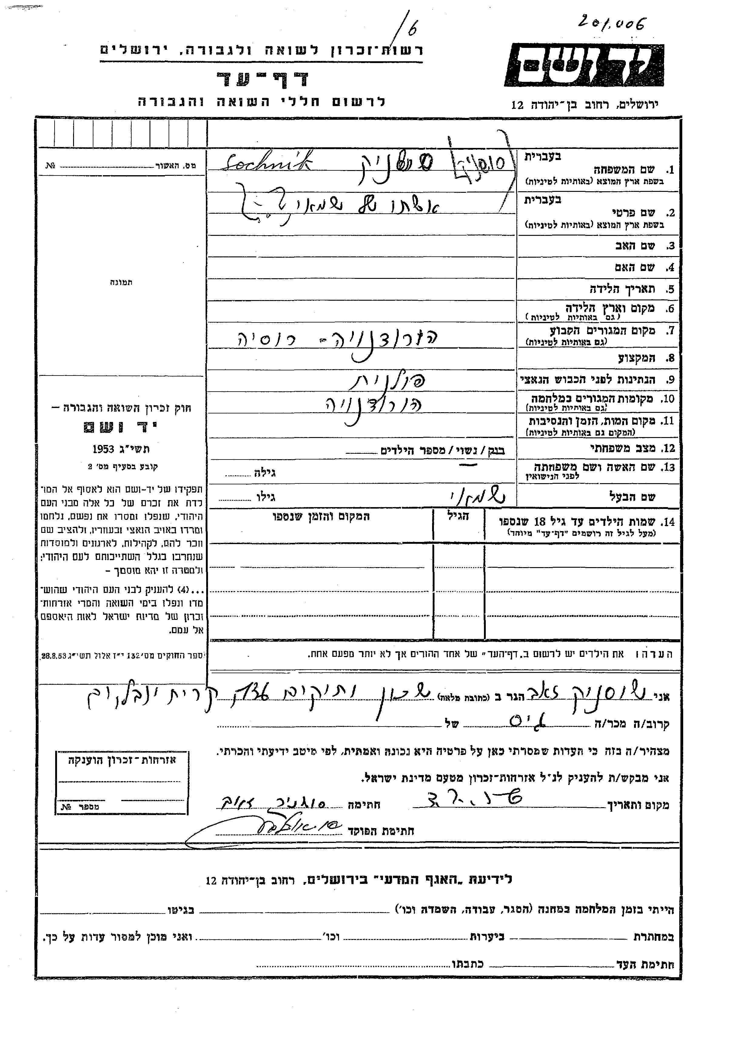 Vorname unbekannt Sochnik. Sie war mit Shamai Verheiratet. Vor dem Zweiten Weltkrieg lebte sie in Horodne, Polen. Während des Krieges war sie in Horodne, Polen.