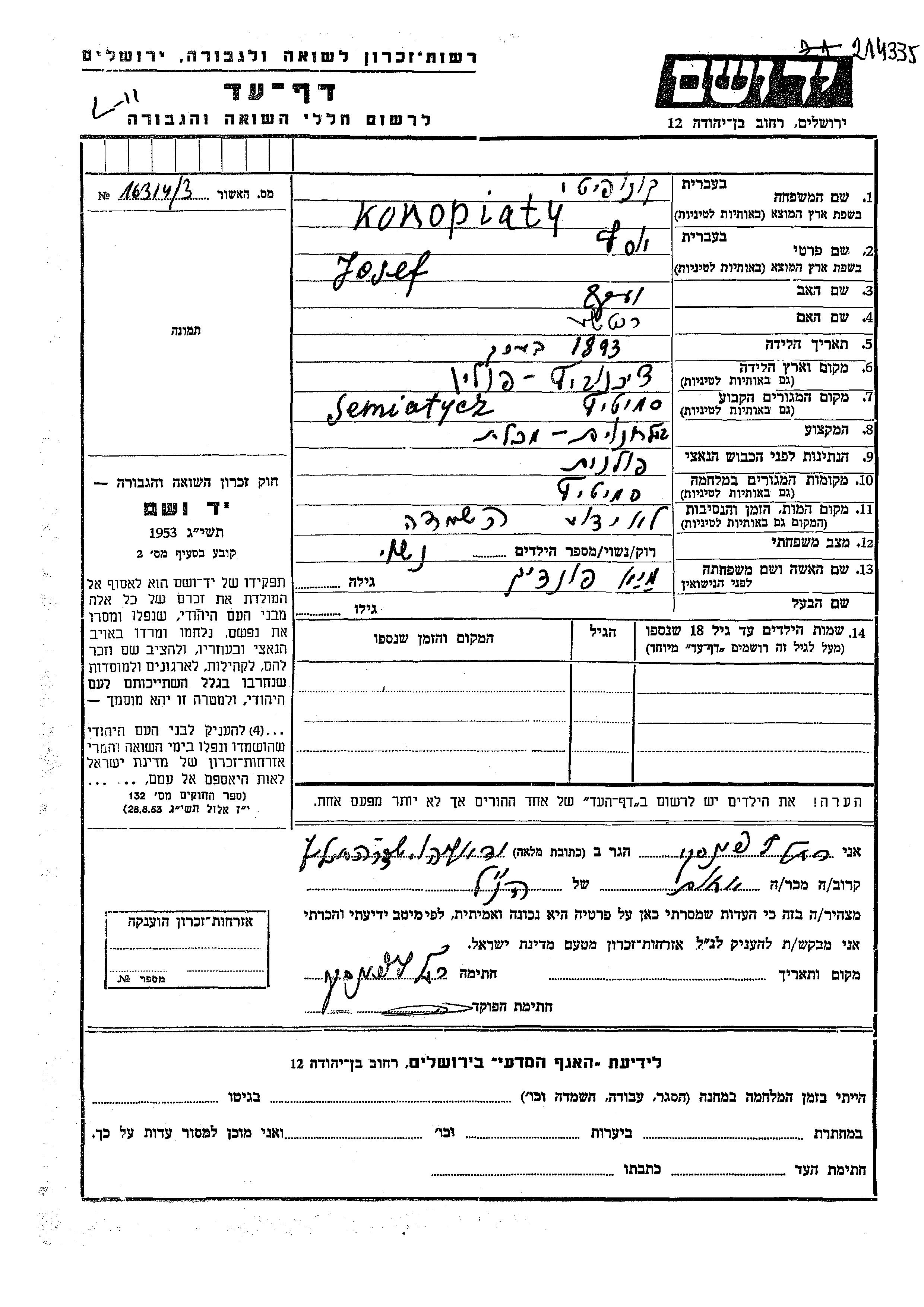 Josef Konopiaty wurde im Jahr 1893 in Ciechanoviec, Polen geboren. Er war der Sohn von Yaakov und Rekhche. Er war Besitzer/-in eines lebensmittelgeschäfts und mit Maria, geb. Pundik Verheiratet. Vor dem Zweiten Weltkrieg lebte er in Siemiatycze, Polen. Während des Krieges war er in Siemiatycze, Polen.