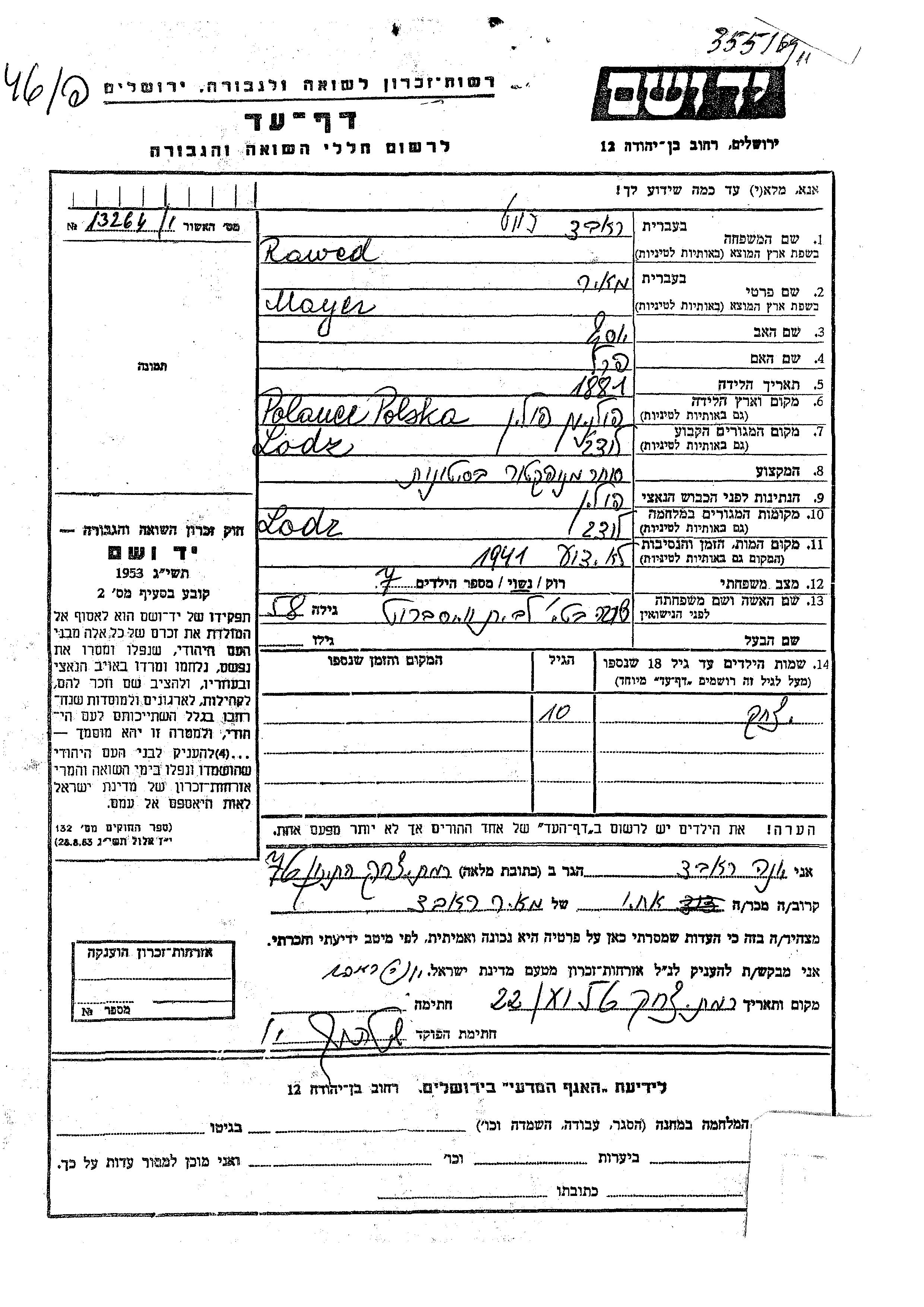 Mayer Rawed wurde im Jahr 1881 in Polanec, Polen geboren. Er war der Sohn von Yosef und Perel. Er war Textilhändler/-in und mit Tova Beti, geb. Veisbrot Verheiratet. Vor dem Zweiten Weltkrieg lebte er in Lodz, Polen. Während des Krieges war er in Lodz, Polen.