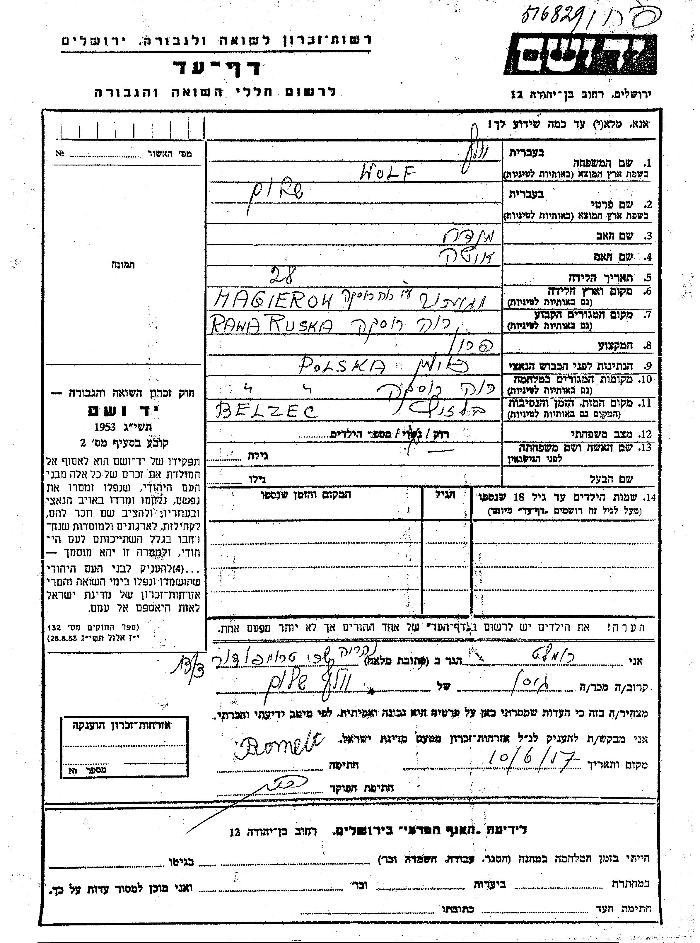 Shalom Wolf wurde in Magierow, Polen geboren. Er war der Sohn von Mendil und Aneta. Er war Kürschner/-in und Ledig. Vor dem Zweiten Weltkrieg lebte er in Rawa Ruska, Polen. Während des Krieges war er in Rawa Ruska, Polen.