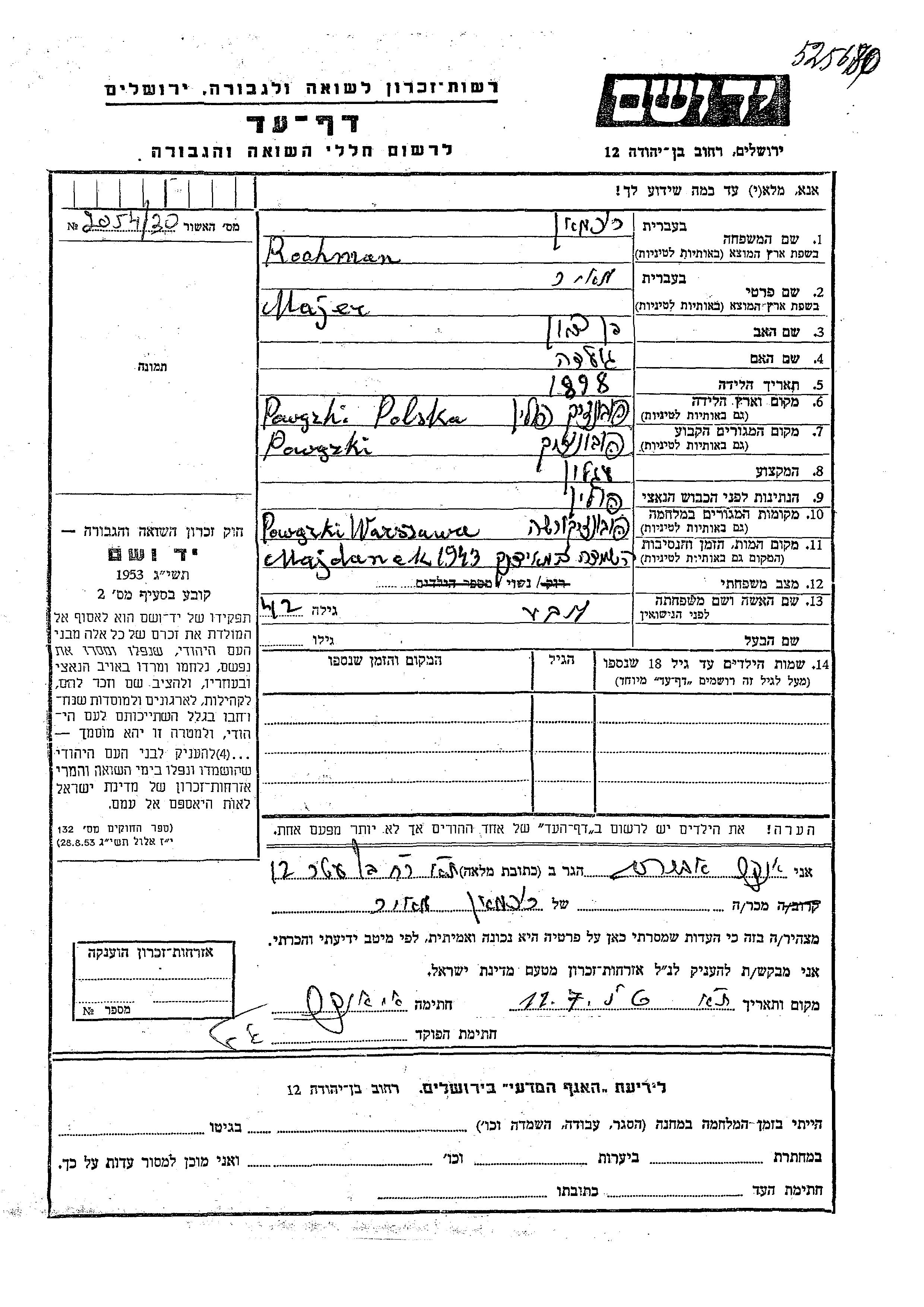 Majer Rochman wurde im Jahr 1898 in Powazki, Polen geboren. Er war der Sohn von Bentzion und Golda. Er war Fuhrmann und mit Lube Verheiratet. Vor dem Zweiten Weltkrieg lebte er in Powazki, Polen. Während des Krieges war er in Powazki, Polen.