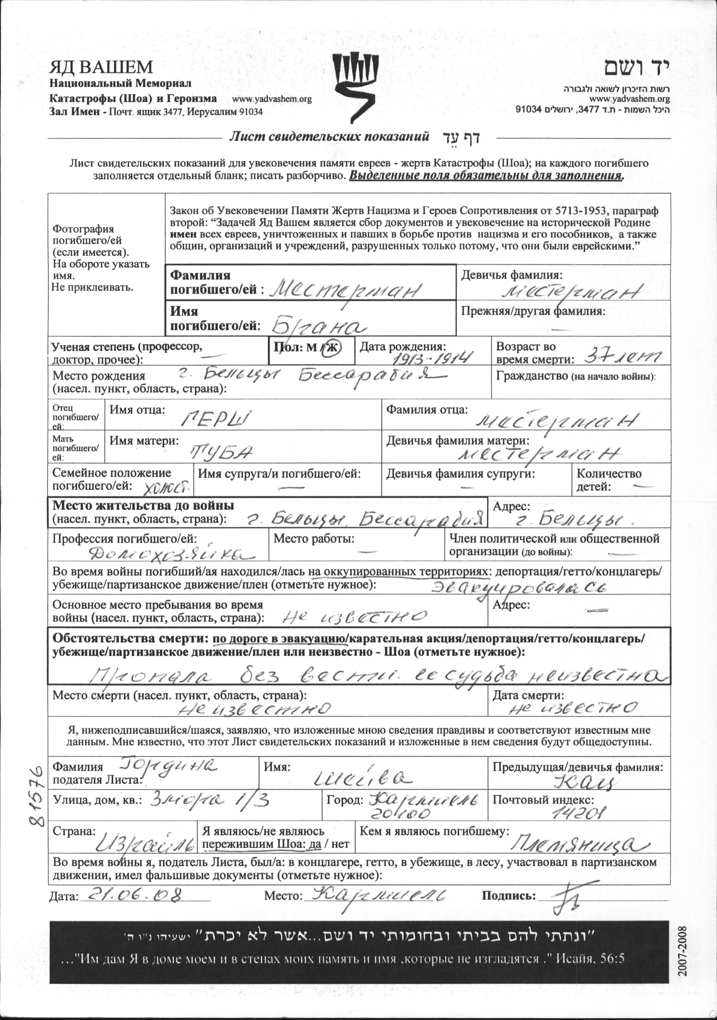 Brana Mesterman wurde im Jahr 1913 in Beltsy, Rumänien geboren. Sie war die Tochter von Gersh und Tuba. Sie war Hausfrau und Ledig. Vor dem Zweiten Weltkrieg lebte sie in Beltsy, Rumänien.