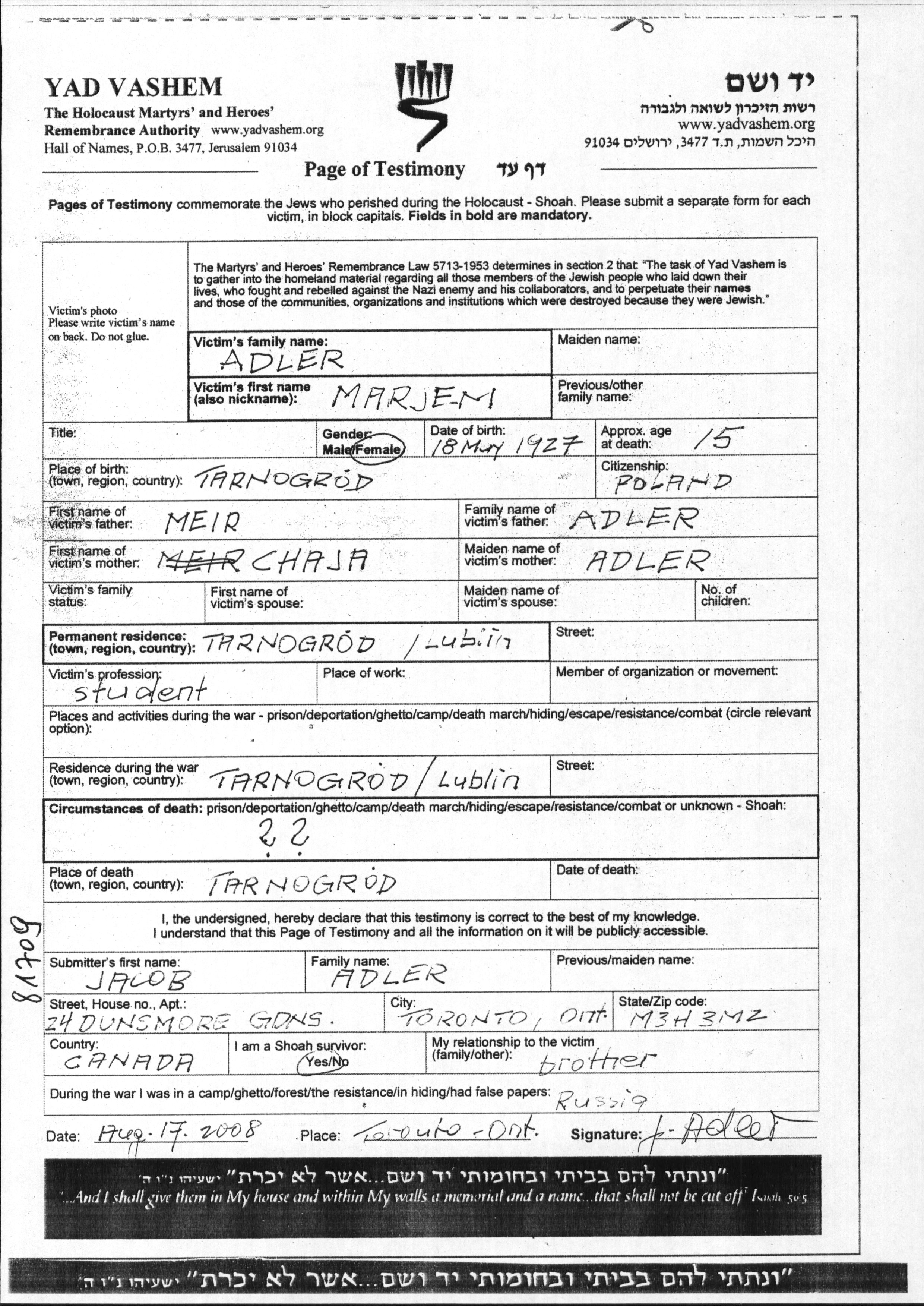 Marjem Adler wurde im Jahr 1927 in Tarnogrod, Polen geboren. Sie war die Tochter von Meir und Chaja. Sie war Student und Jugendliche/-r. Vor dem Zweiten Weltkrieg lebte sie in Tarnogrod, Polen. Während des Krieges war sie in Tarnogrod, Polen.