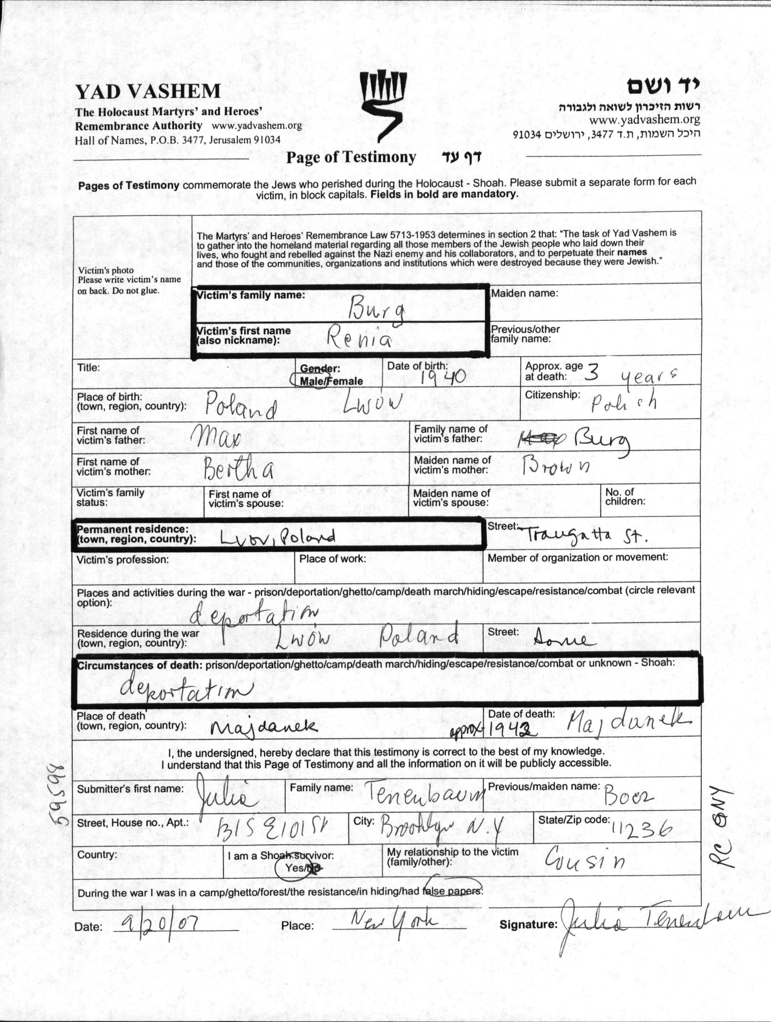 Renia wurde in der Schoah ermordet. Todesort: Majdanek, Polen im Jahr 1942.