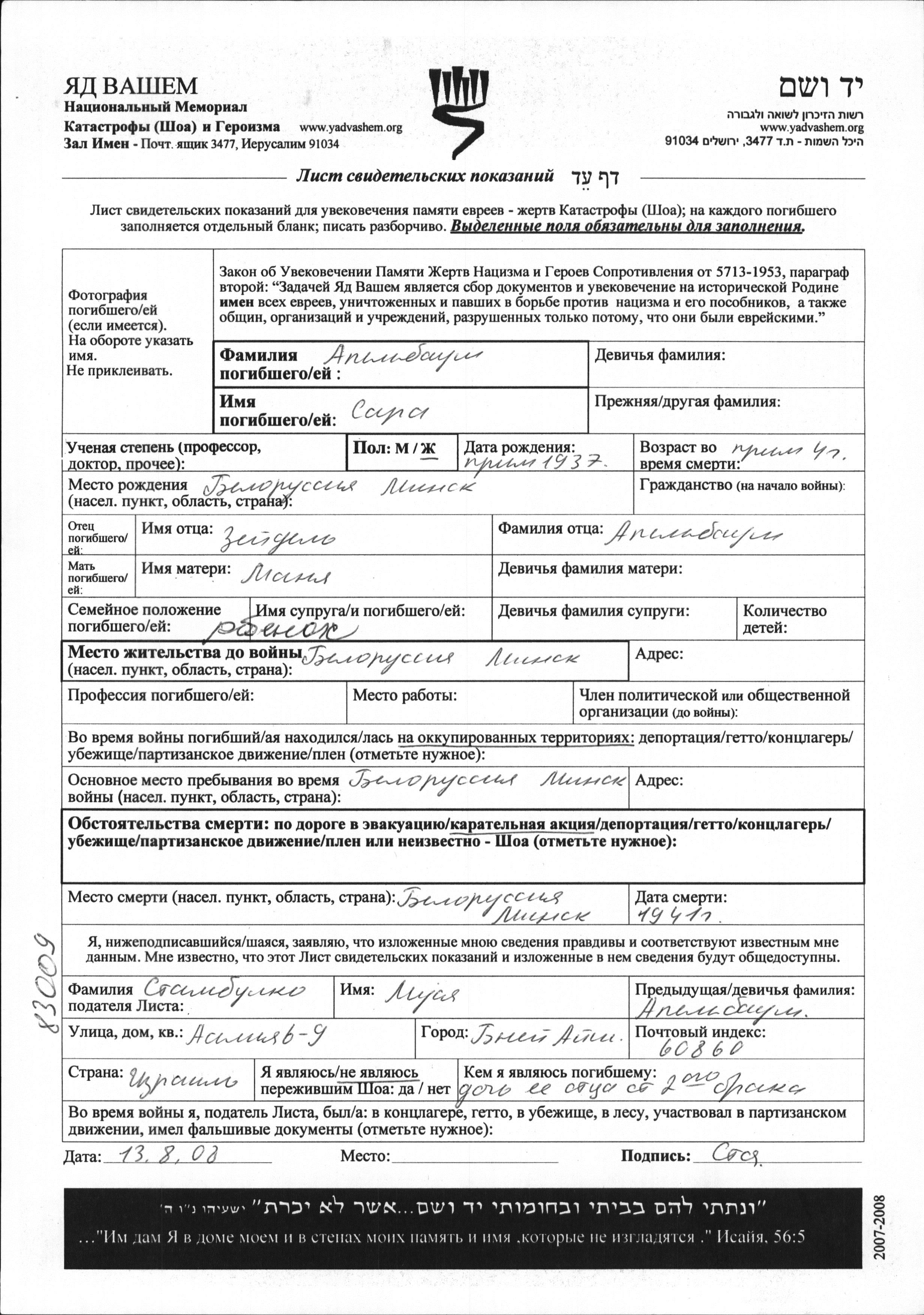 Apelbaum Sara 1937 Minsk, Weißrussland (UdSSR) Gedenkblatt