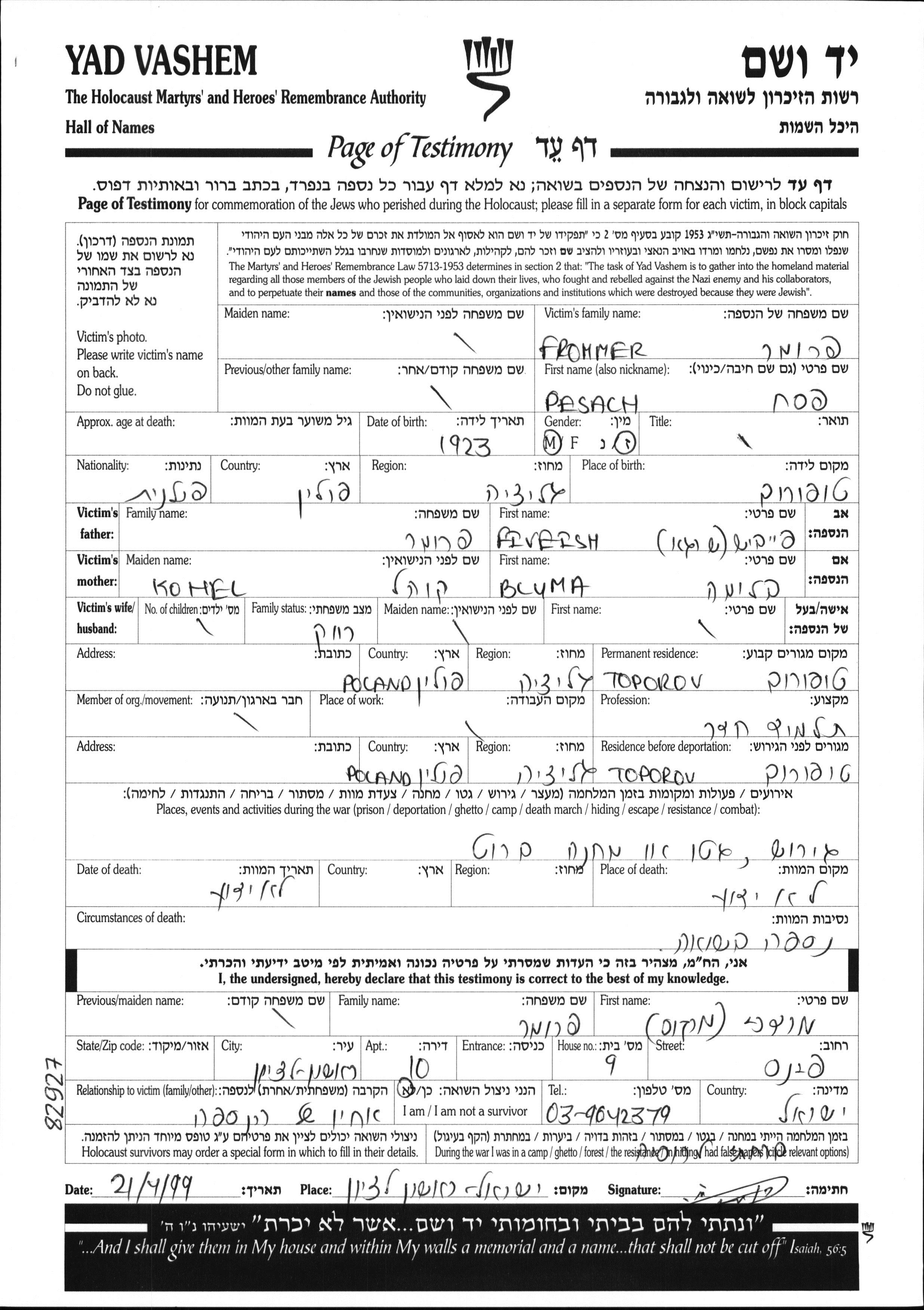 Pesach Frommer wurde im Jahr 1923 in Toporow, Polen geboren. Er war der Sohn von Fiveish Shraga und Blyma, geb. Kohel. Er war Jeschiwahschüler und Ledig. Vor dem Zweiten Weltkrieg lebte er in Toporow, Polen. Während des Krieges war er in Getto.