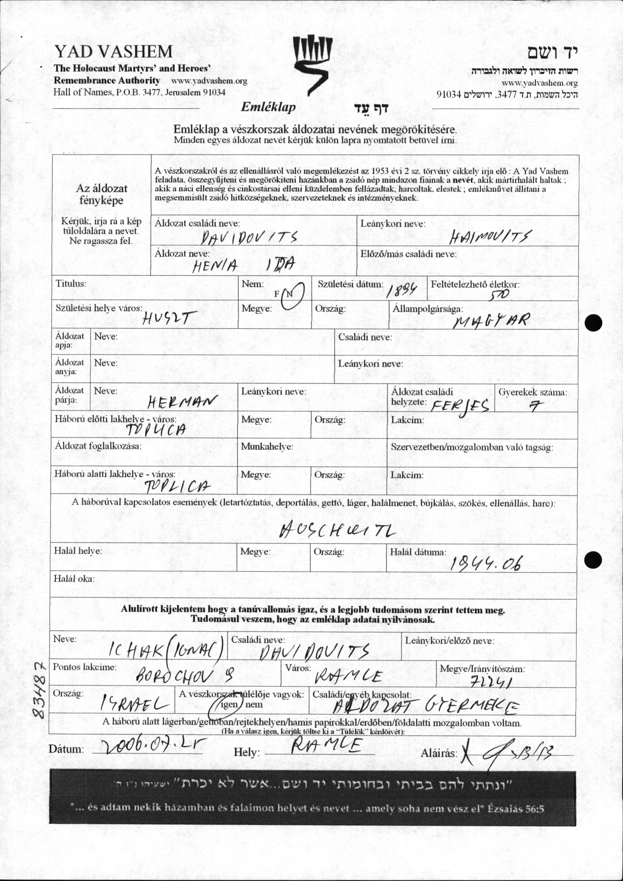 Henia Ida Davidovits, geb. Haimovits wurde im Jahr 1894 in Huszt, Tschechoslowakei geboren. Sie war mit Herman Verheiratet. Vor dem Zweiten Weltkrieg lebte sie in Toplica, Rumänien. Während des Krieges war sie in Toplica, Rumänien.