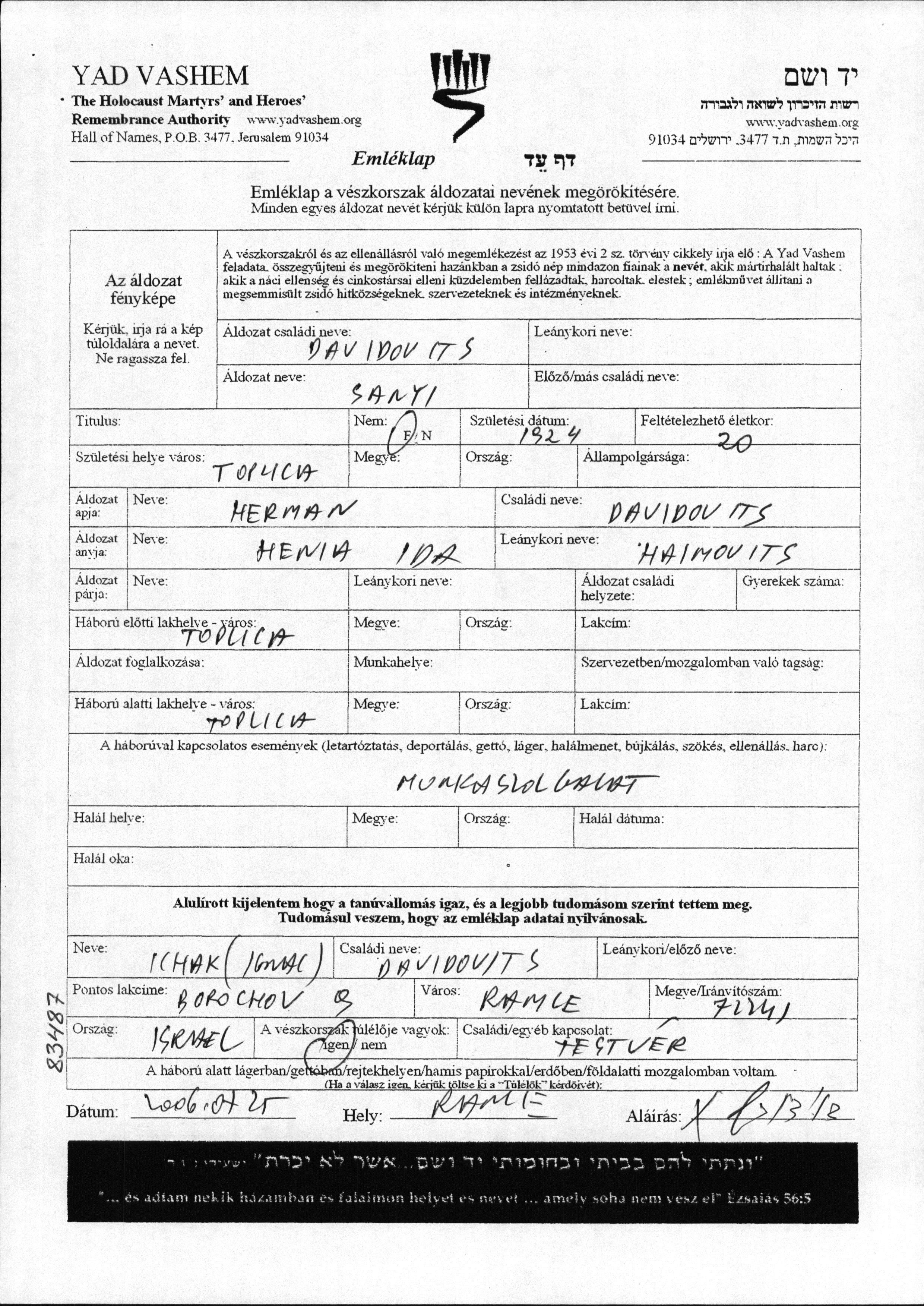 Sanyi Davidovits wurde im Jahr 1924 in Toplica, Rumänien geboren. Sie war die Tochter von Herman und Henia Ida, geb. Haimovits. Sie war Ledig. Vor dem Zweiten Weltkrieg lebte sie in Toplica, Rumänien. Während des Krieges war sie in Toplica, Rumänien.