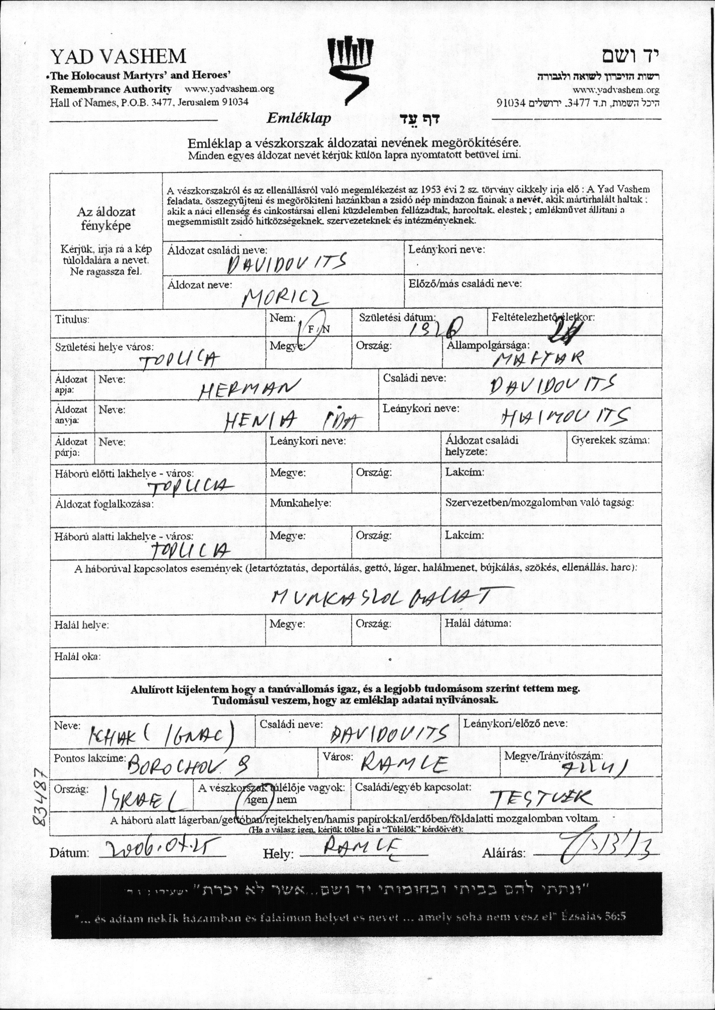 Moricz Davidovits wurde im Jahr 1920 in Toplica, Rumänien geboren. Er war der Sohn von Herman und Henia Ida, geb. Haimovits. Er war Ledig. Vor dem Zweiten Weltkrieg lebte er in Toplica, Rumänien. Während des Krieges war er in Toplica, Rumänien.