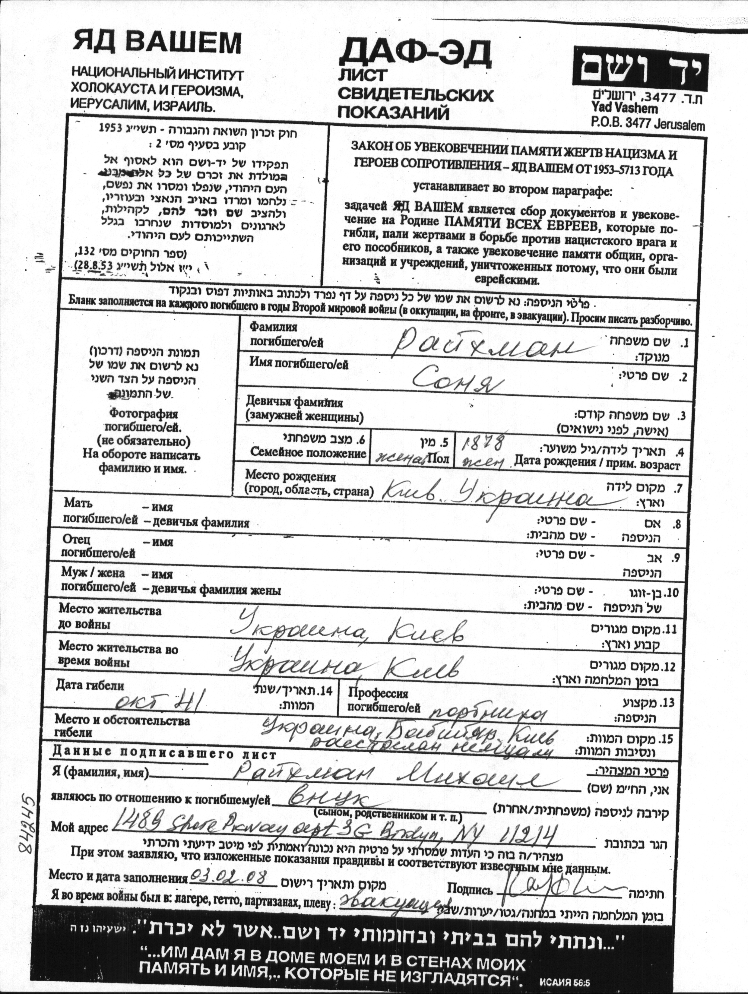 Sonya Raikhman wurde im Jahr 1878 in Kiev, Ukraine (UdSSR) geboren. Sie war Schneiderin und Verheiratet. Vor dem Zweiten Weltkrieg lebte sie in Kiev, Ukraine (UdSSR). Während des Krieges war sie in Kiev, Ukraine (UdSSR).
