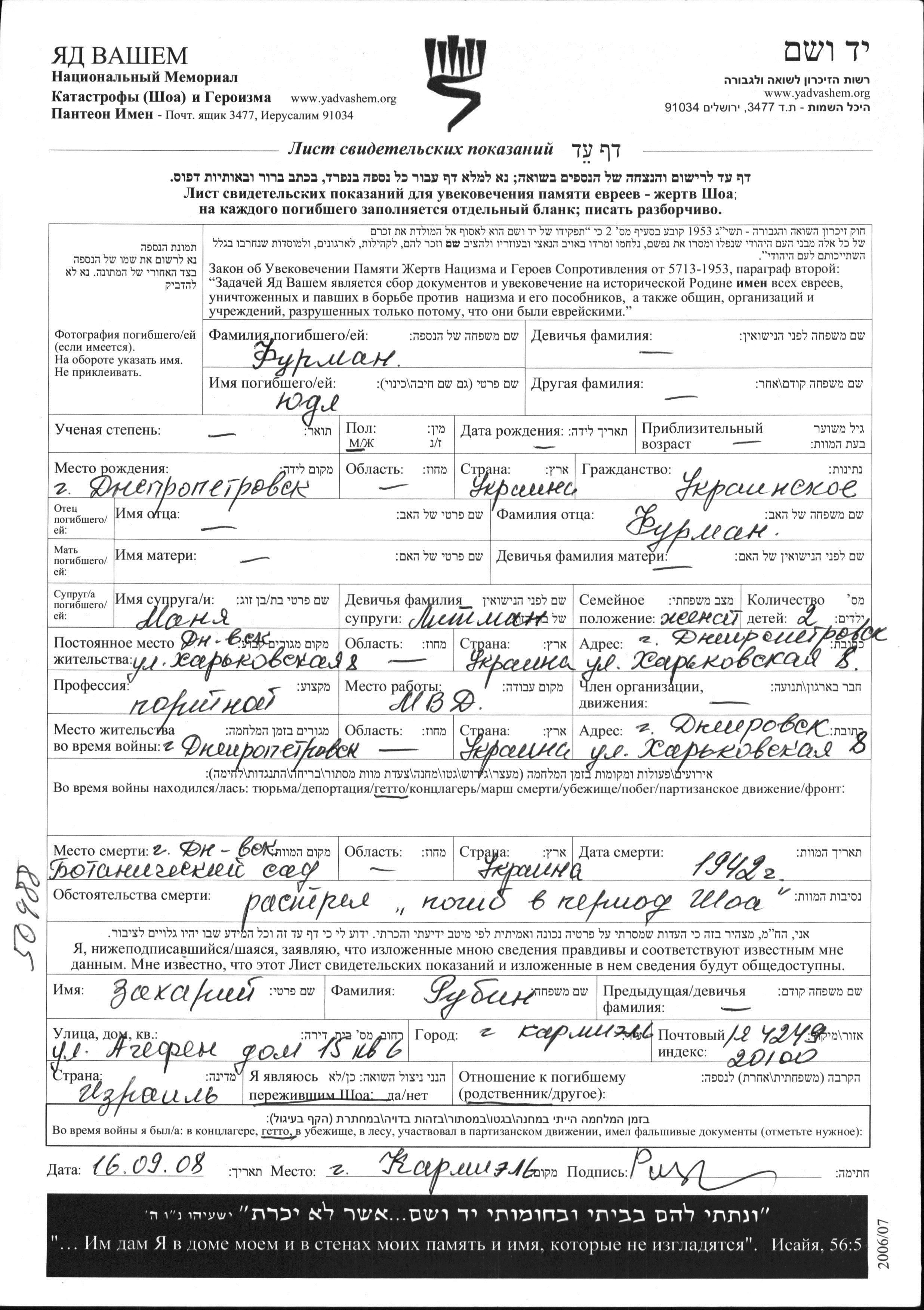 Yudya wurde in der Schoah ermordet. Todesort: Dnepropetrovsk, Ukraine (UdSSR) im Jahr 1942.