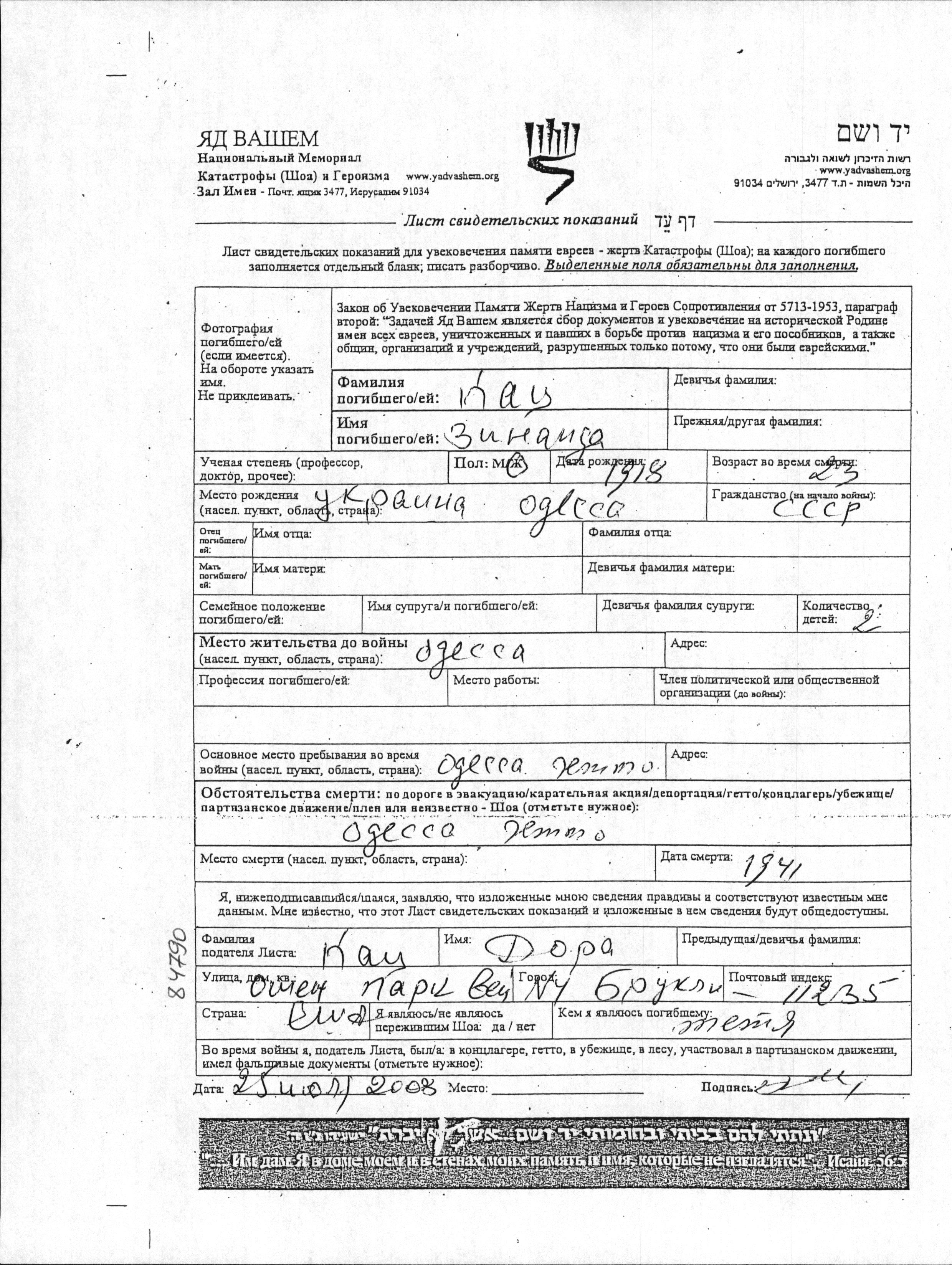 Zinayida Katz wurde im Jahr 1918 in Odessa, Ukraine (UdSSR) geboren. Vor dem Zweiten Weltkrieg lebte sie in Odessa, Ukraine (UdSSR). Während des Krieges war sie in Odessa, Ukraine (UdSSR).