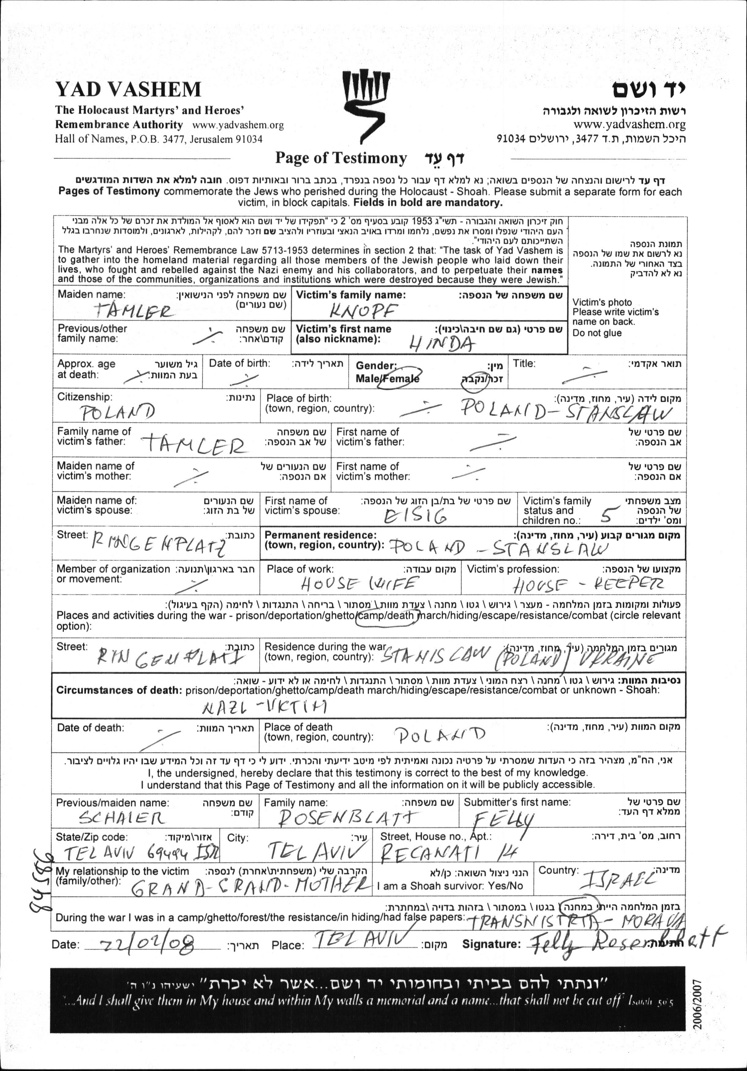 Hinda Knopf, geb. Tamler wurde in Stanislawow, Polen geboren. Sie war Hausfrau und mit Eisig Verheiratet. Vor dem Zweiten Weltkrieg lebte sie in Stanislawow, Polen. Während des Krieges war sie in Stanislawow, Polen.