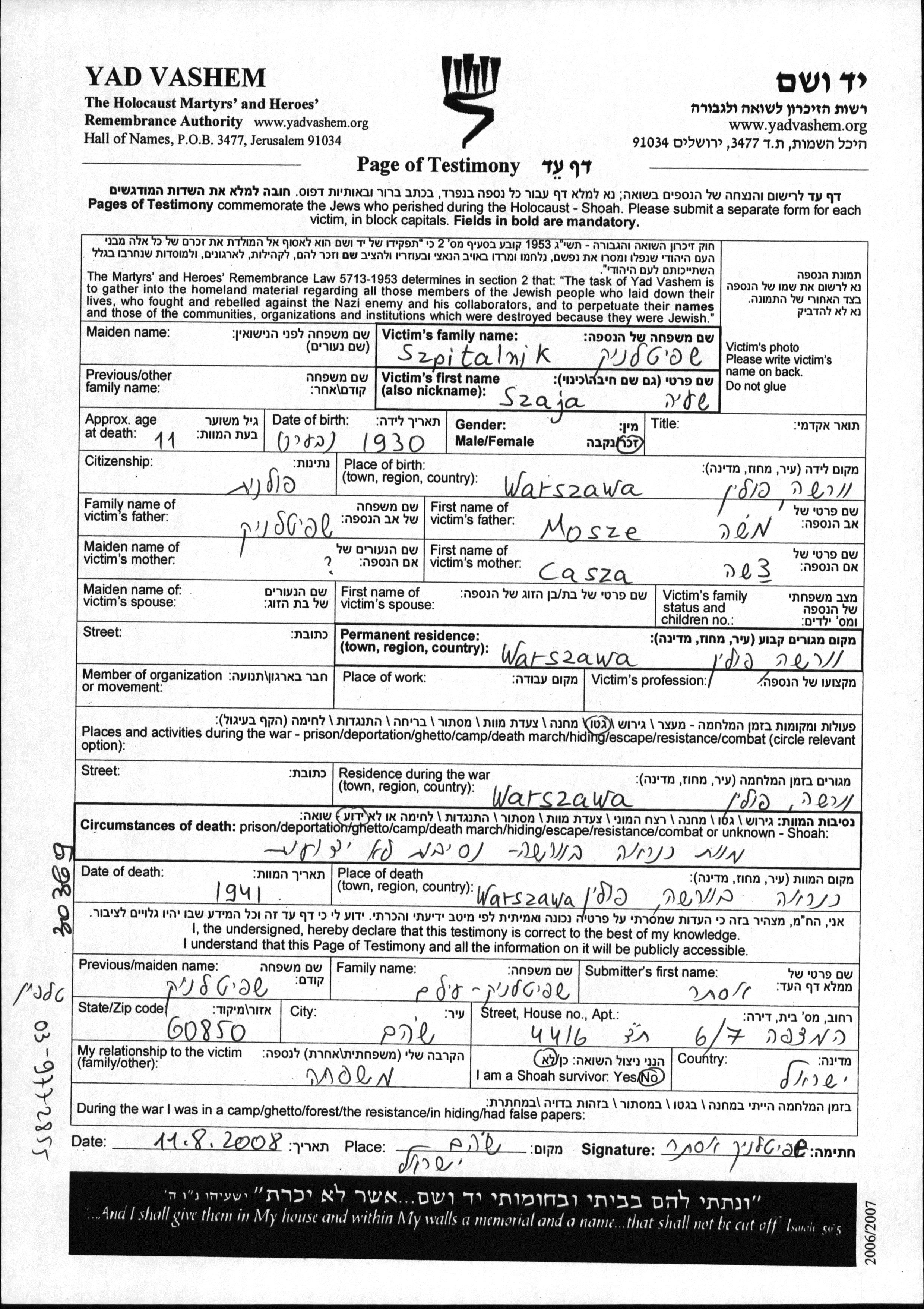 Szaja Szpitalnik wurde im Jahr 1930 in Warszawa, Polen geboren. Er war der Sohn von Mosze und Casza. Er war Kind. Vor dem Zweiten Weltkrieg lebte er in Warszawa, Polen. Während des Krieges war er in Warszawa, Polen.