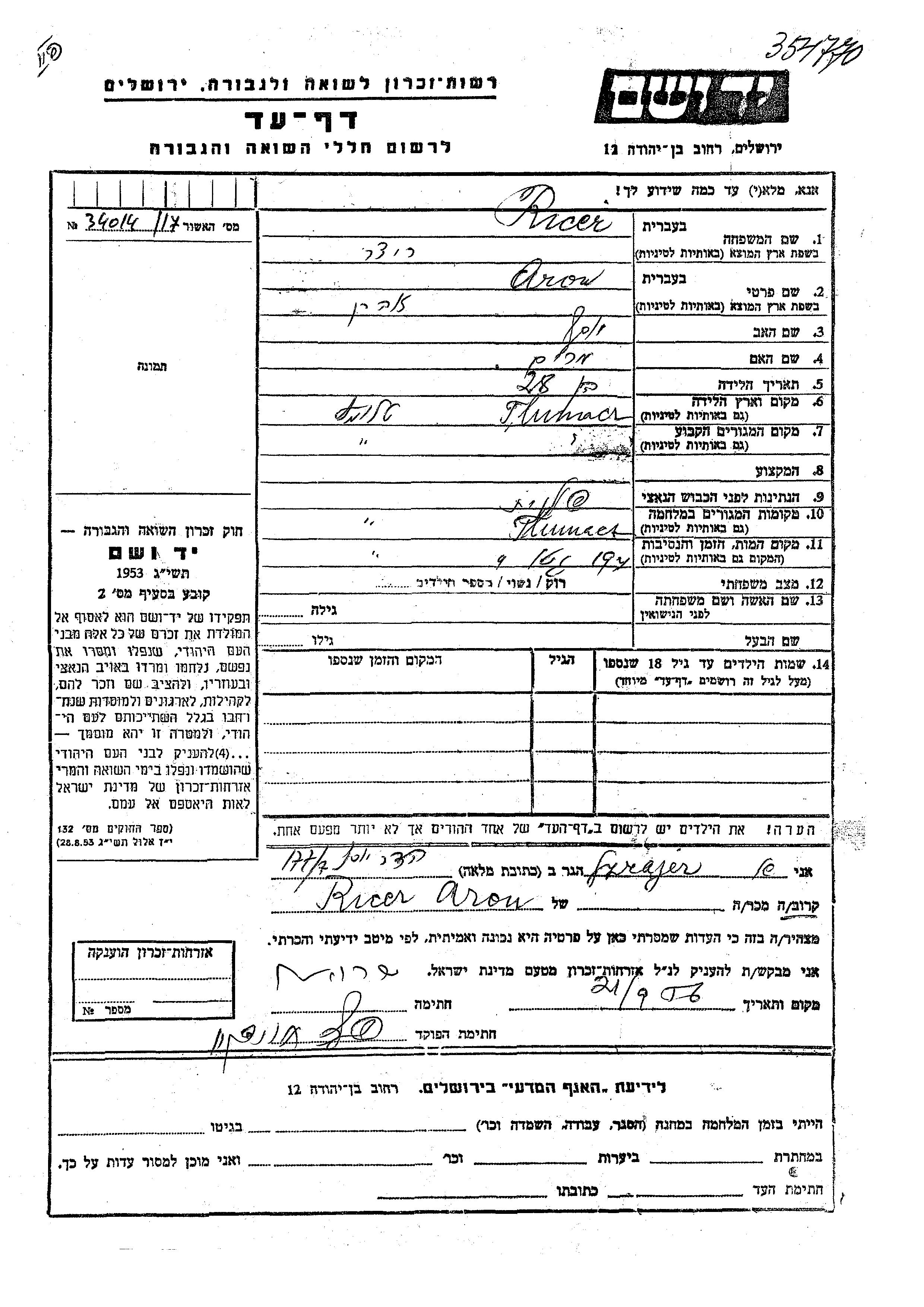 Aron Ricer Rizer wurde in Tlumacz, Polen geboren. Er war der Sohn von Yosef und Miriam. Vor dem Zweiten Weltkrieg lebte er in Tlumacz, Polen. Während des Krieges war er in Tlumacz, Polen.