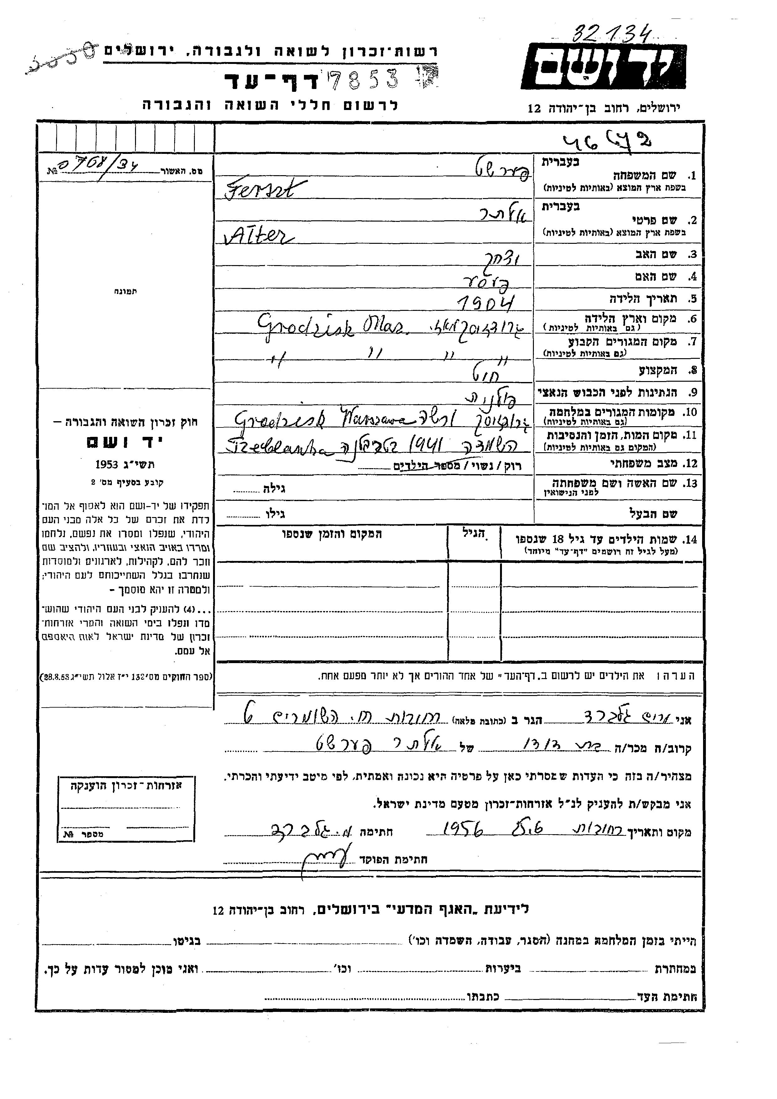 Alter Ferszt wurde im Jahr 1904 in Grodzhisk Mazovyet, Polen geboren. Er war der Sohn von Yitzkhak und Pese. Er war Schneider und Ledig. Vor dem Zweiten Weltkrieg lebte er in Grodzhisk Mazovyet, Polen. Während des Krieges war er in Grodzisk Mazowiecki, Polen.
