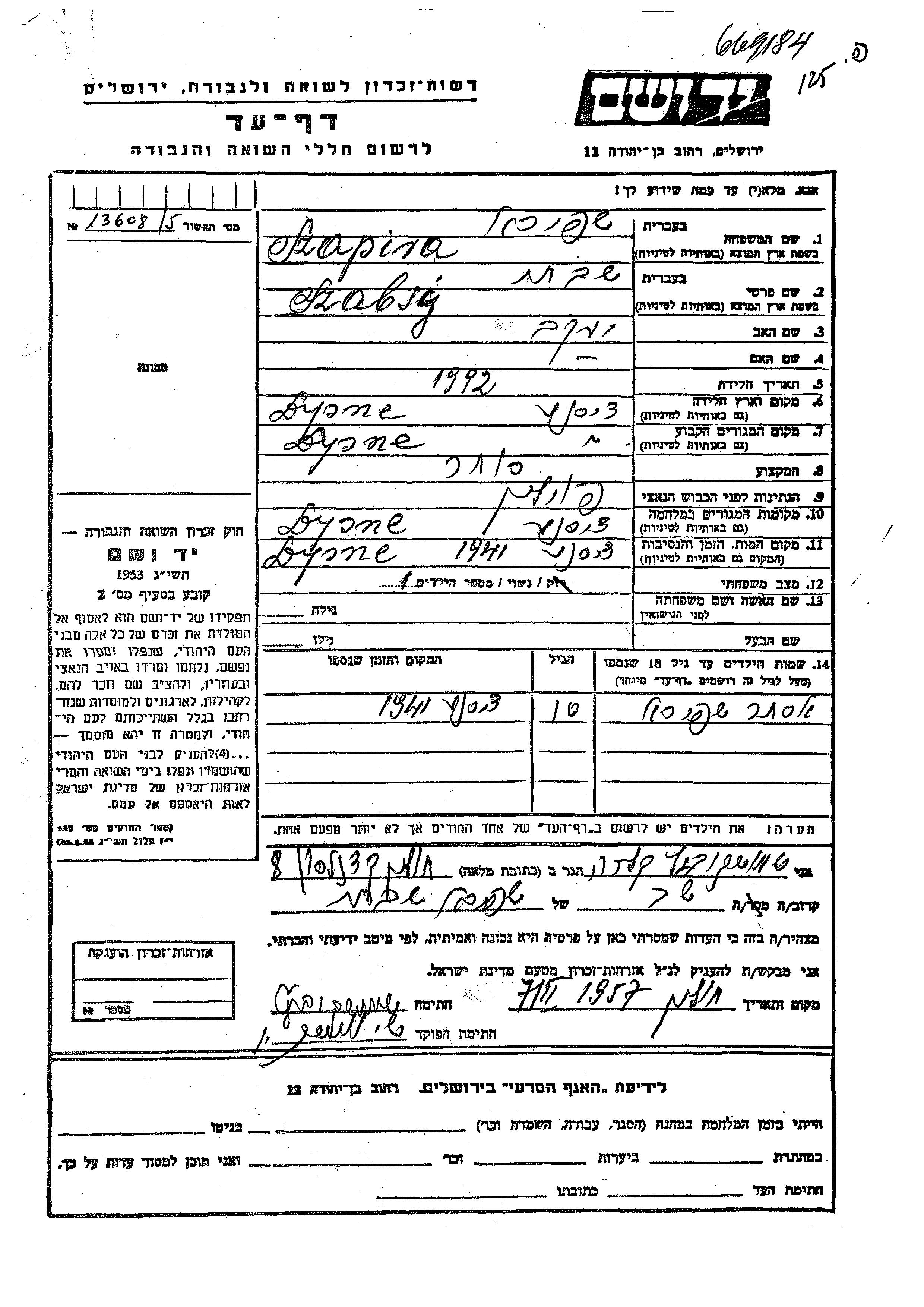 Szabsy Szapira wurde im Jahr 1892 in Dzisna, Polen geboren. Er war der Sohn von Yaakov. Er war Kaufmann/-frau und Verheiratet. Vor dem Zweiten Weltkrieg lebte er in Dzisna, Polen. Während des Krieges war er in Dzisna, Polen.