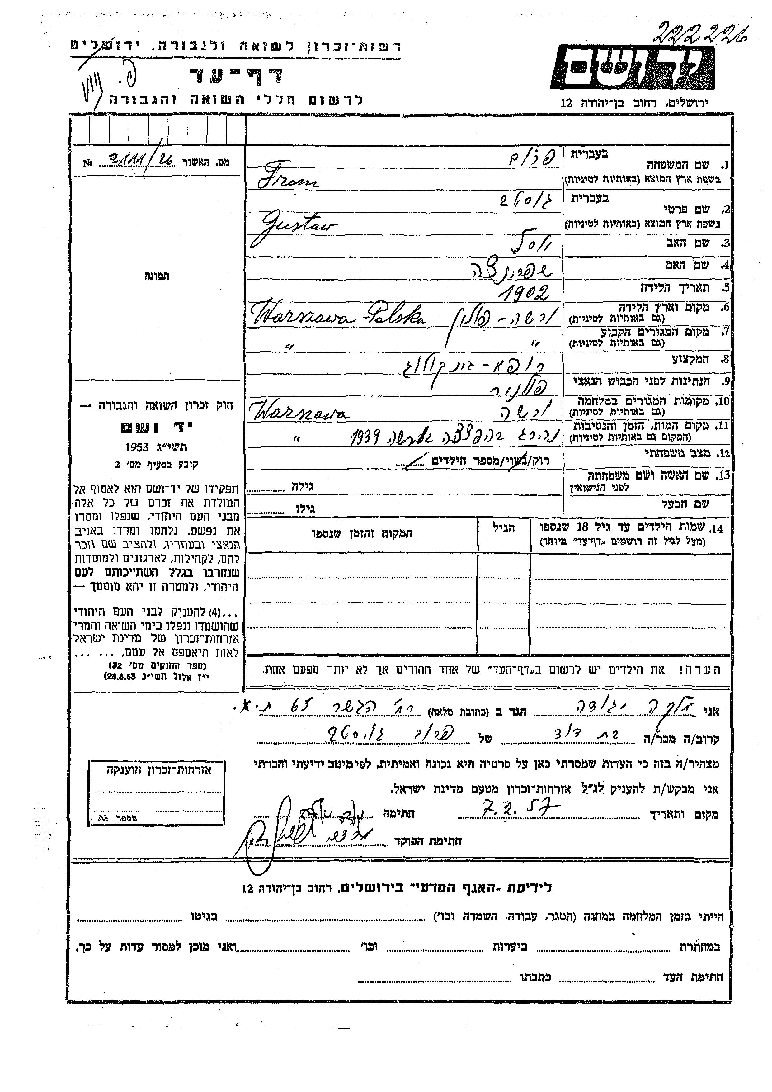 Dr. Gustaw From Frum wurde im Jahr 1902 in Warszawa, Polen geboren. Er war der Sohn von Yosel und Shprintza. Er war Frauenarzt und Ledig. Vor dem Zweiten Weltkrieg lebte er in Warszawa, Polen. Während des Krieges war er in Warszawa, Polen.