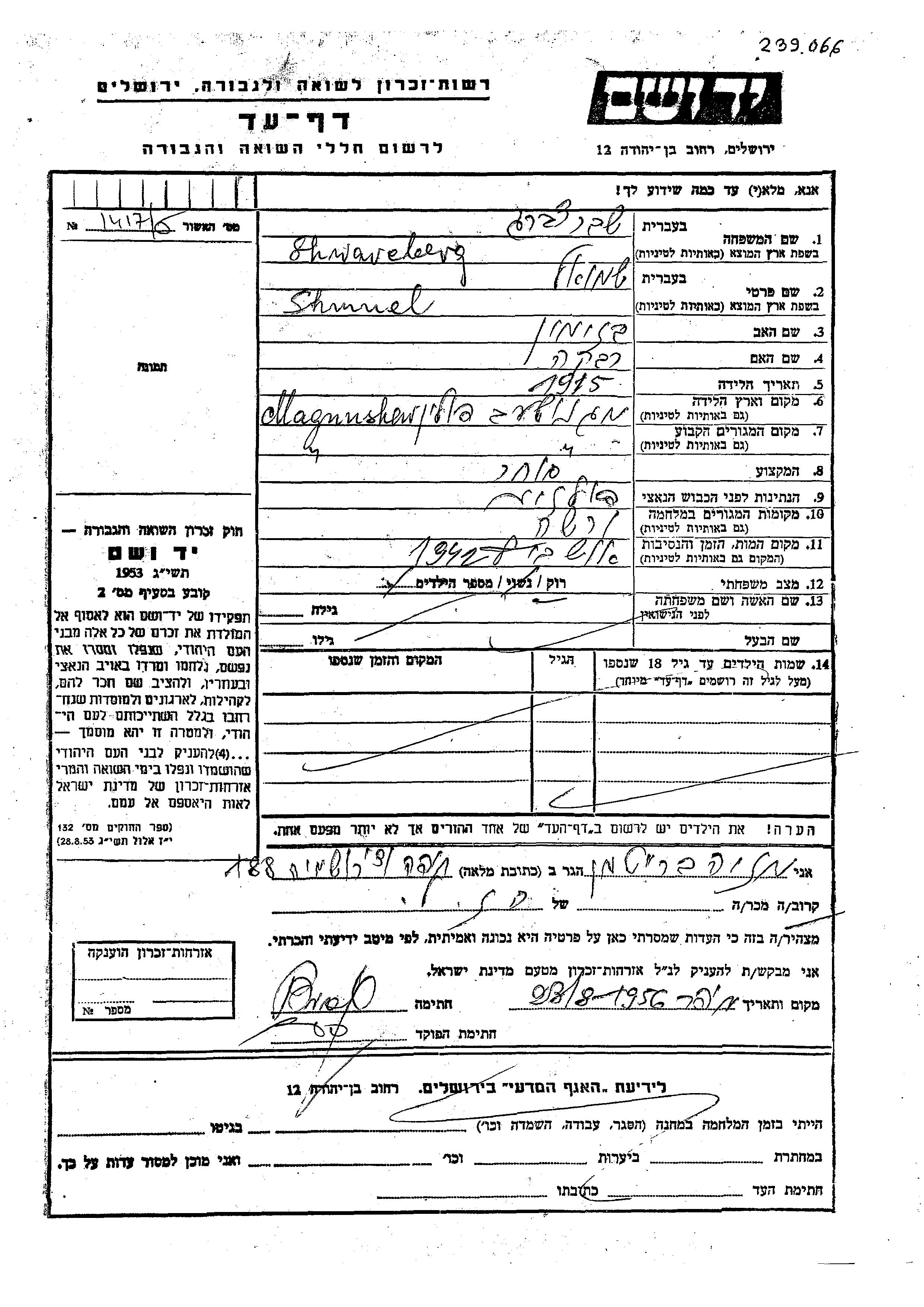 Shmuel Shwarcberg wurde im Jahr 1915 in Magnuszew, Polen geboren. Er war der Sohn von Beniamin und Rivka. Er war Kaufmann/-frau und Ledig. Vor dem Zweiten Weltkrieg lebte er in Magnuszew, Polen. Während des Krieges war er in Warsaw, Polen.