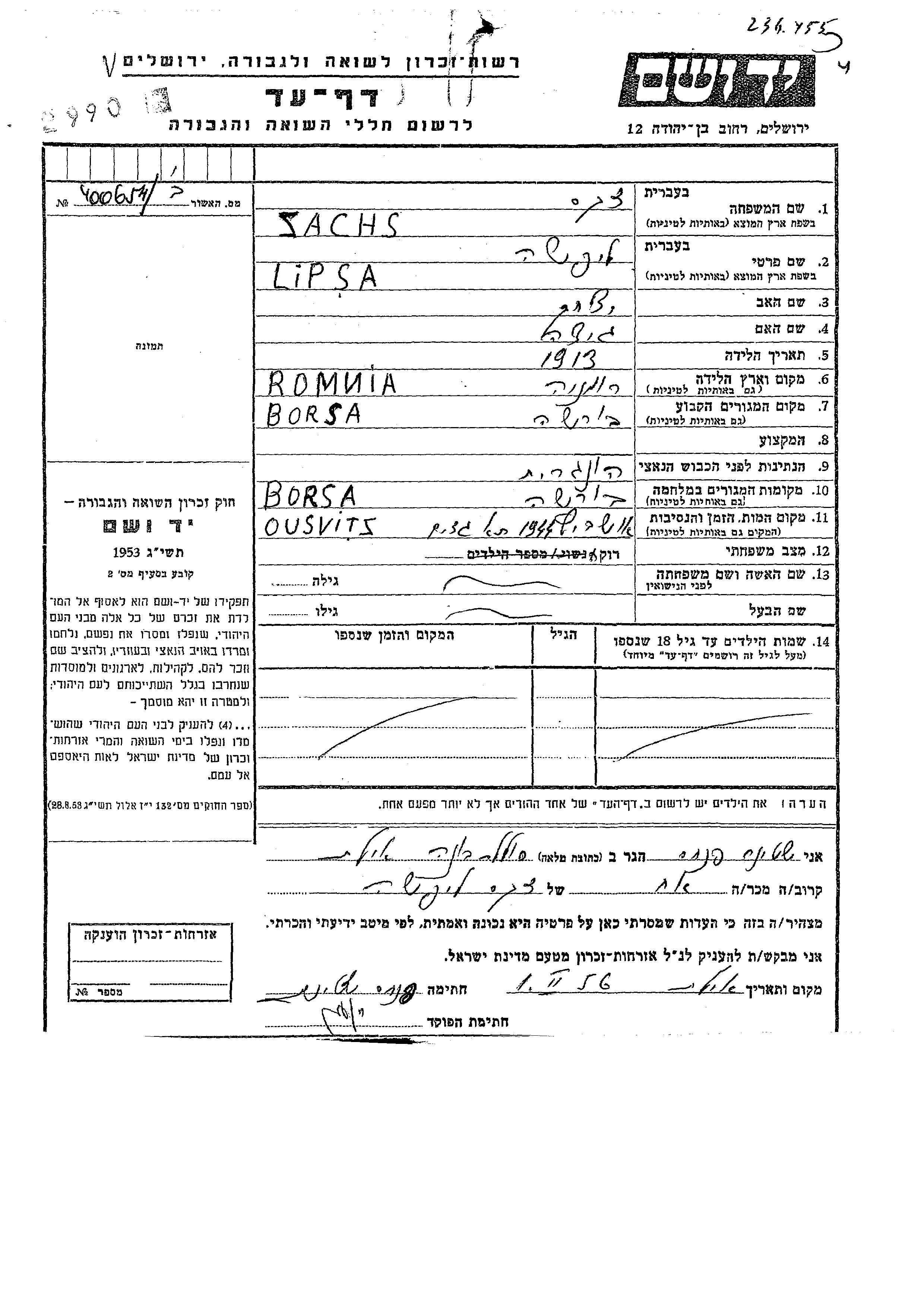 Lipsa Zachs wurde im Jahr 1913 in Rumänien geboren. Sie war die Tochter von Yitzkhak und Gitza. Sie war Ledig. Vor dem Zweiten Weltkrieg lebte sie in Borsa, Rumänien. Während des Krieges war sie in Borsa, Rumänien.