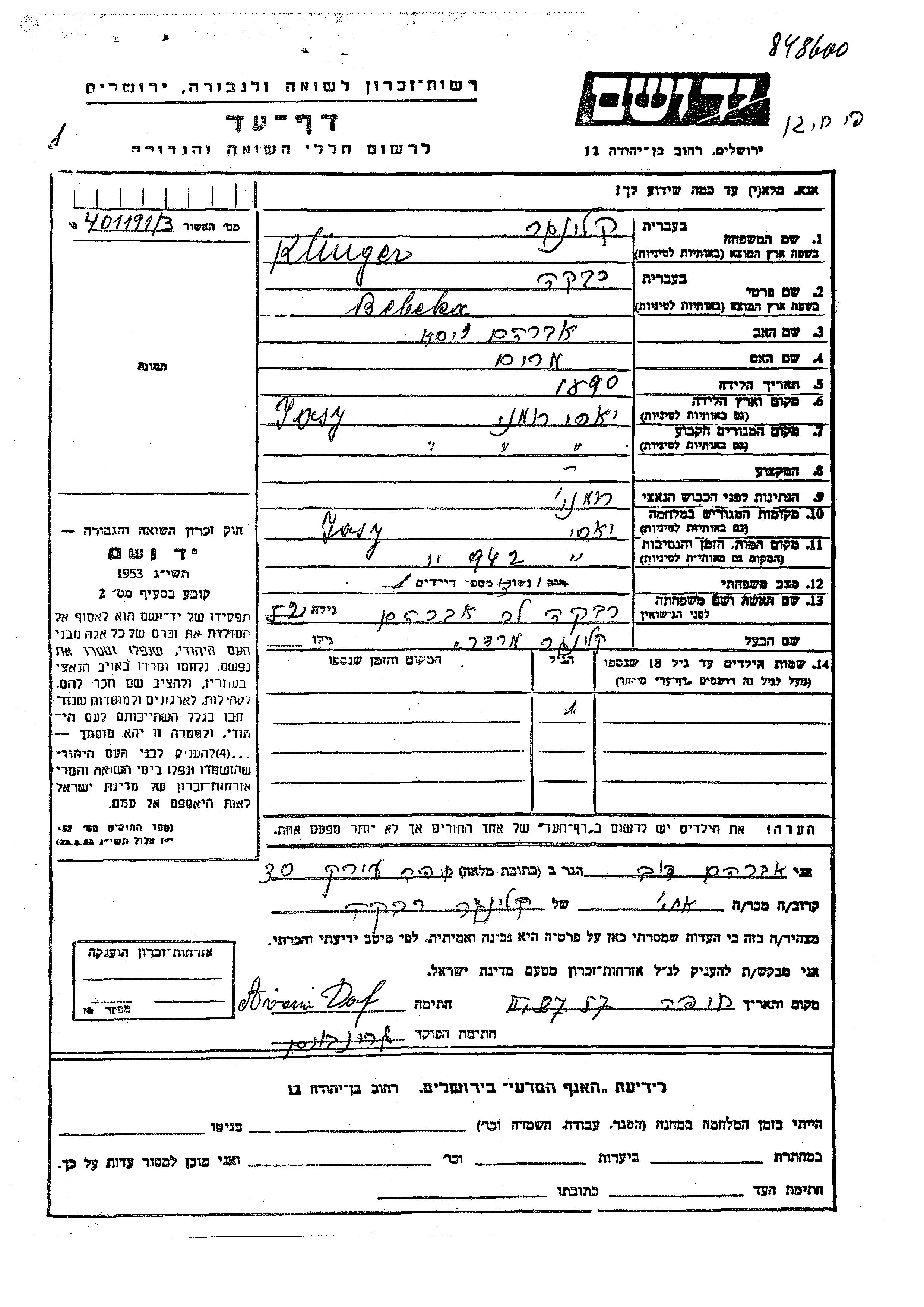 Rebeka Klinger, geb. Avraham wurde im Jahr 1890 in Iasi, Rumänien geboren. Sie war die Tochter von Avraham Zisa und Miriam. Sie war mit Mordekhai Verheiratet. Vor dem Zweiten Weltkrieg lebte sie in Iasi, Rumänien. Während des Krieges war sie in Iasi, Rumänien.
