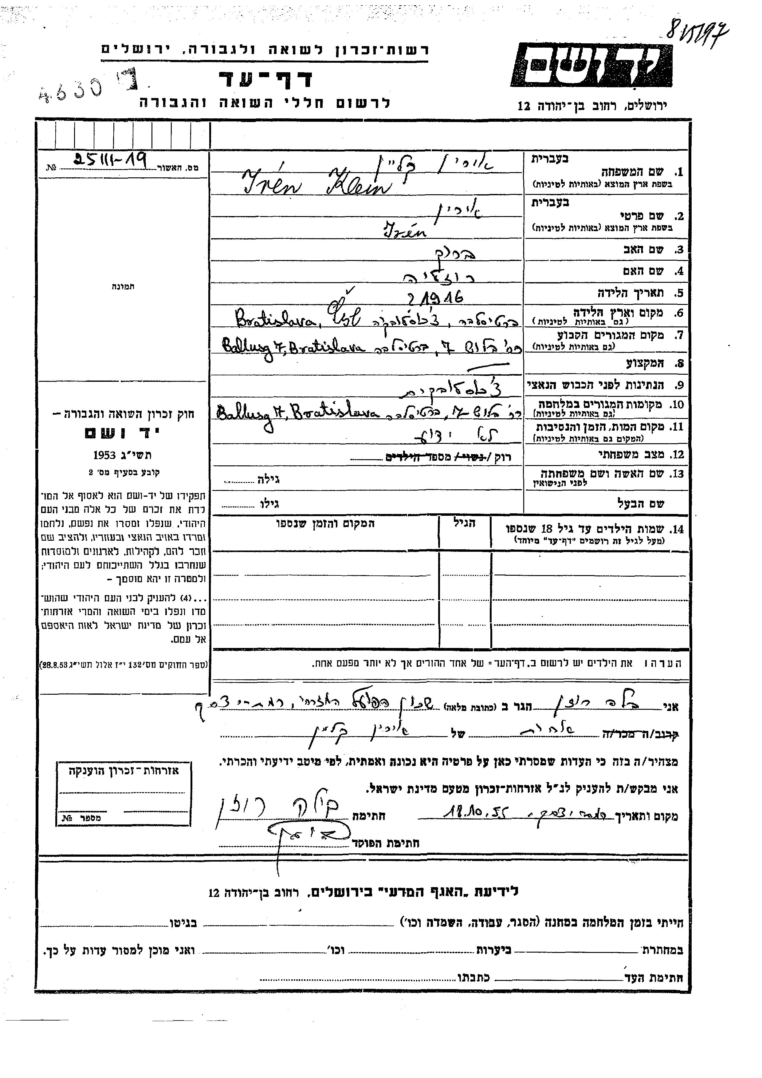 Jren Klein wurde im Jahr 1916 in Bratislava, Tschechoslowakei geboren. Sie war die Tochter von Barukh und Rozalia. Sie war Ledig. Vor dem Zweiten Weltkrieg lebte sie in Bratislava, Tschechoslowakei. Während des Krieges war sie in Bratislava, Tschechoslowakei.