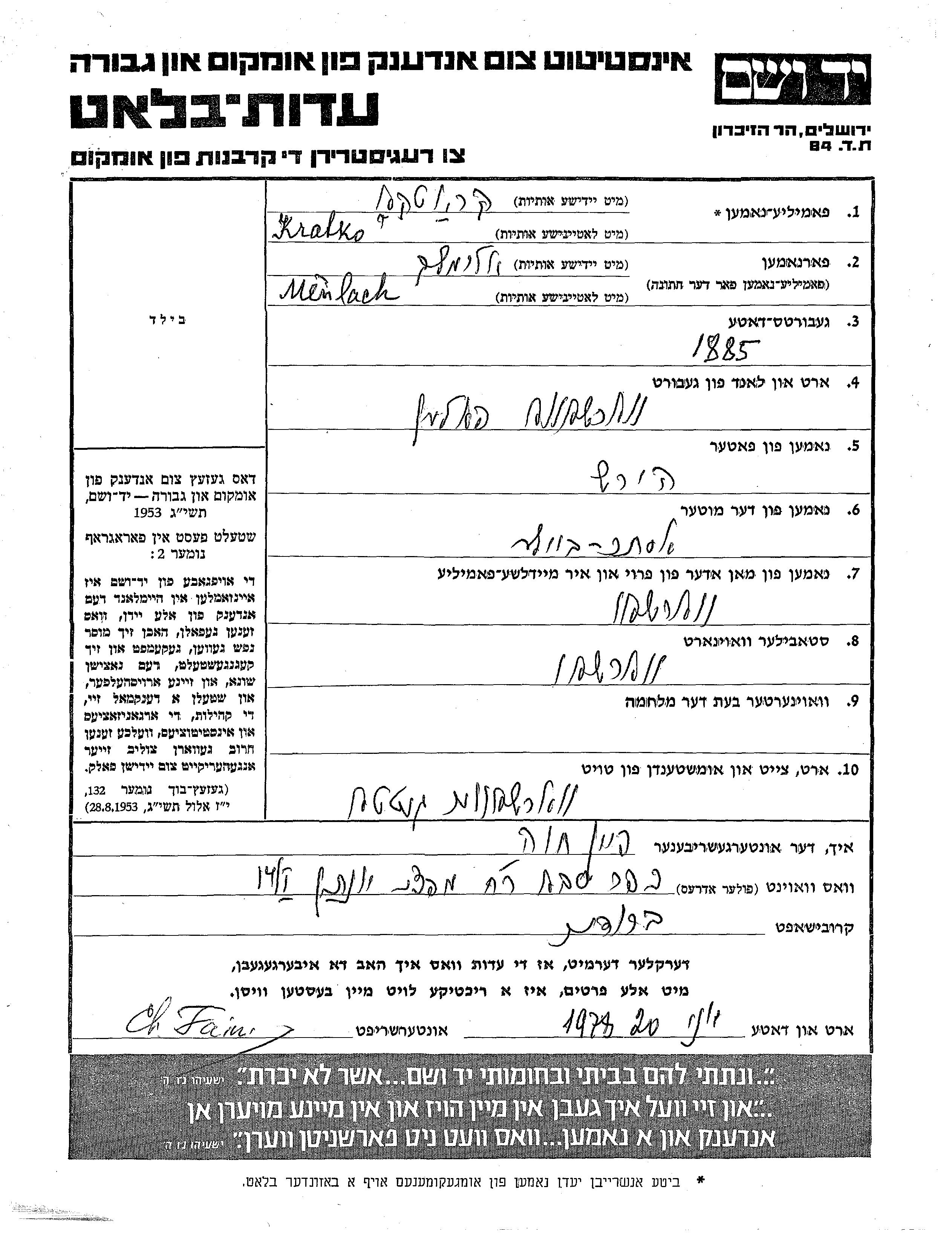 Meilach Elimelekh Kratka wurde im Jahr 1885 in Warsaw, Polen geboren. Er war der Sohn von Hirsh und Ester Beile. Vor dem Zweiten Weltkrieg lebte er in Warsaw, Polen.