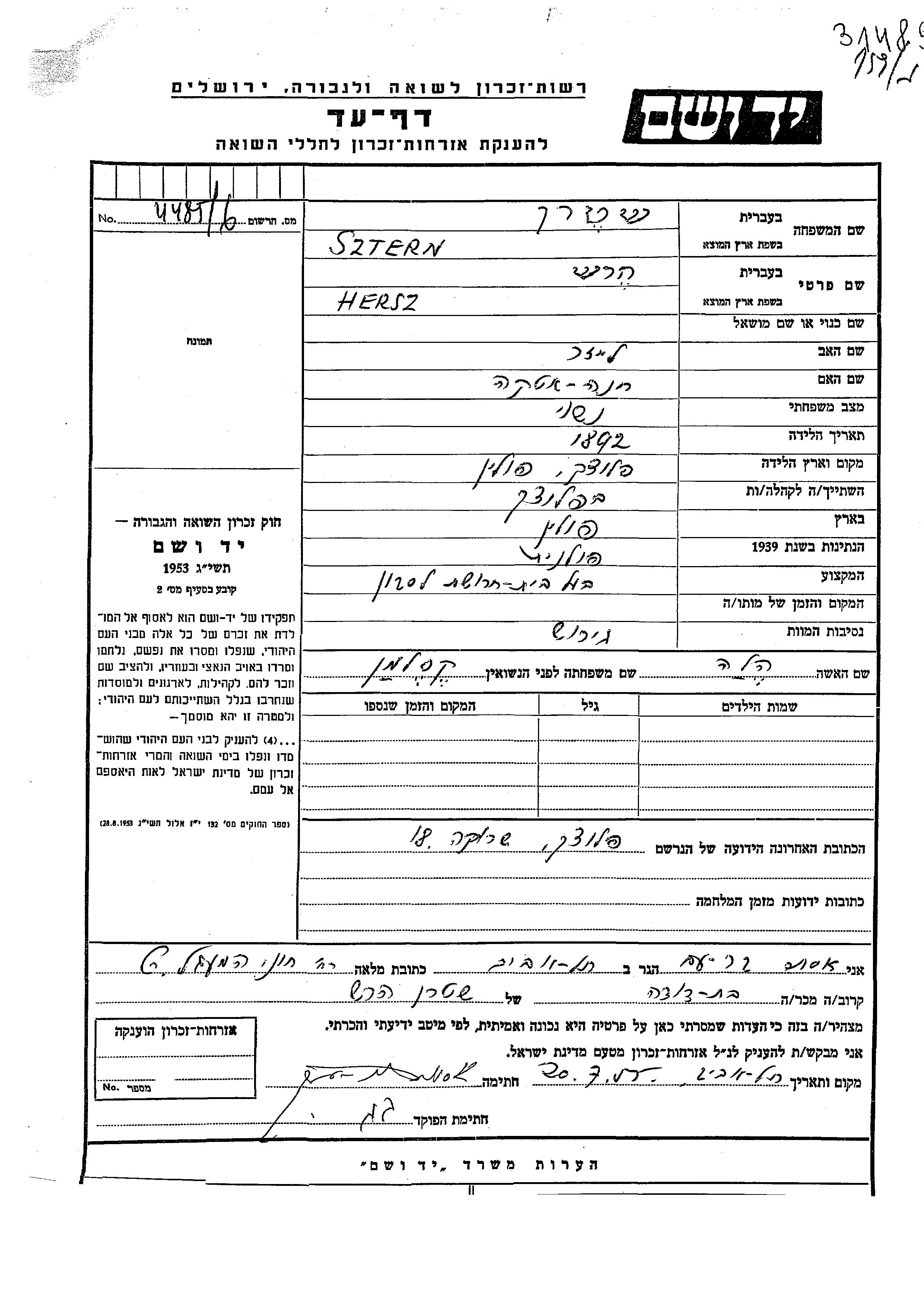 Hersz Sztern wurde im Jahr 1892 in Plock, Polen geboren. Er war der Sohn von Leizer und Khana Etka. Er war Seifenfabrikbesitzer und mit Hela, geb. Keselman Verheiratet. Vor dem Zweiten Weltkrieg lebte er in Plock, Polen.
