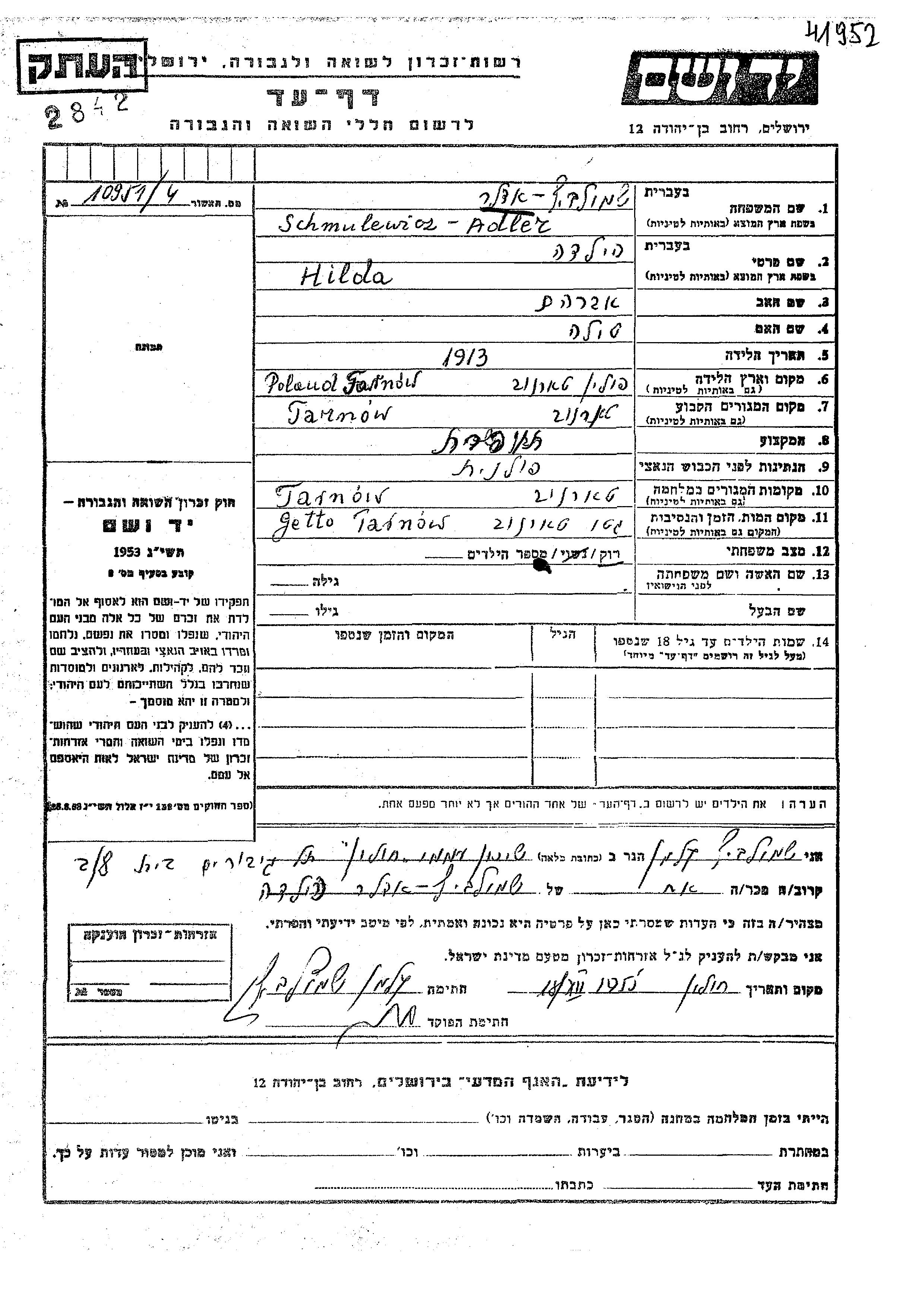 Hilda Schmulewicz Shmilevitz Adler wurde im Jahr 1913 in Tarnow, Polen geboren. Sie war die Tochter von Avraham und Tila. Sie war Schneiderin und Ledig. Vor dem Zweiten Weltkrieg lebte sie in Tarnow, Polen. Während des Krieges war sie in Tarnow, Polen.