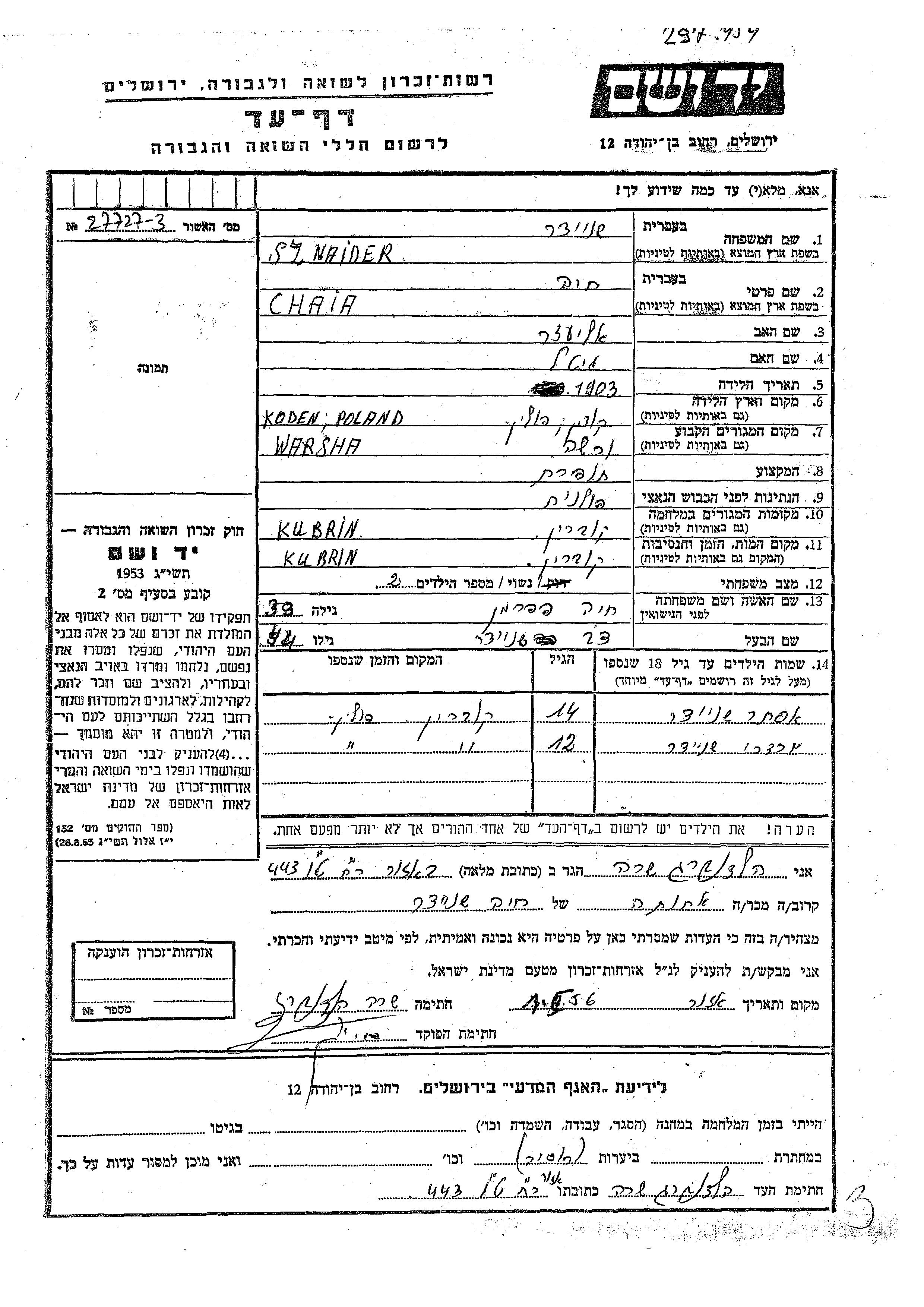 Chaia wurde in der Schoah ermordet. Todesort: Kubrin, Polen.