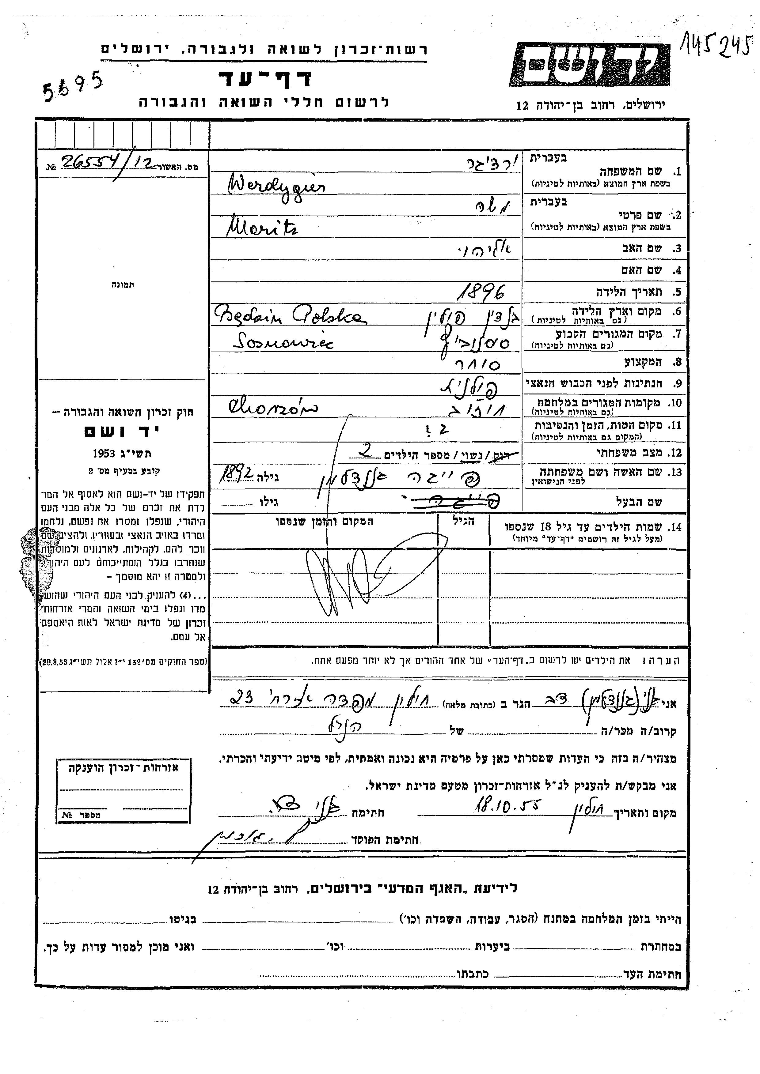 Moritz Moshe Werdygier wurde im Jahr 1896 in Będzin, Polen geboren. Er war der Sohn von Eliahu. Er war Kaufmann/-frau und mit Feiga, geb. Genendelman Verheiratet. Vor dem Zweiten Weltkrieg lebte er in Sosnowic, Polen. Während des Krieges war er in Chorzow, Polen.