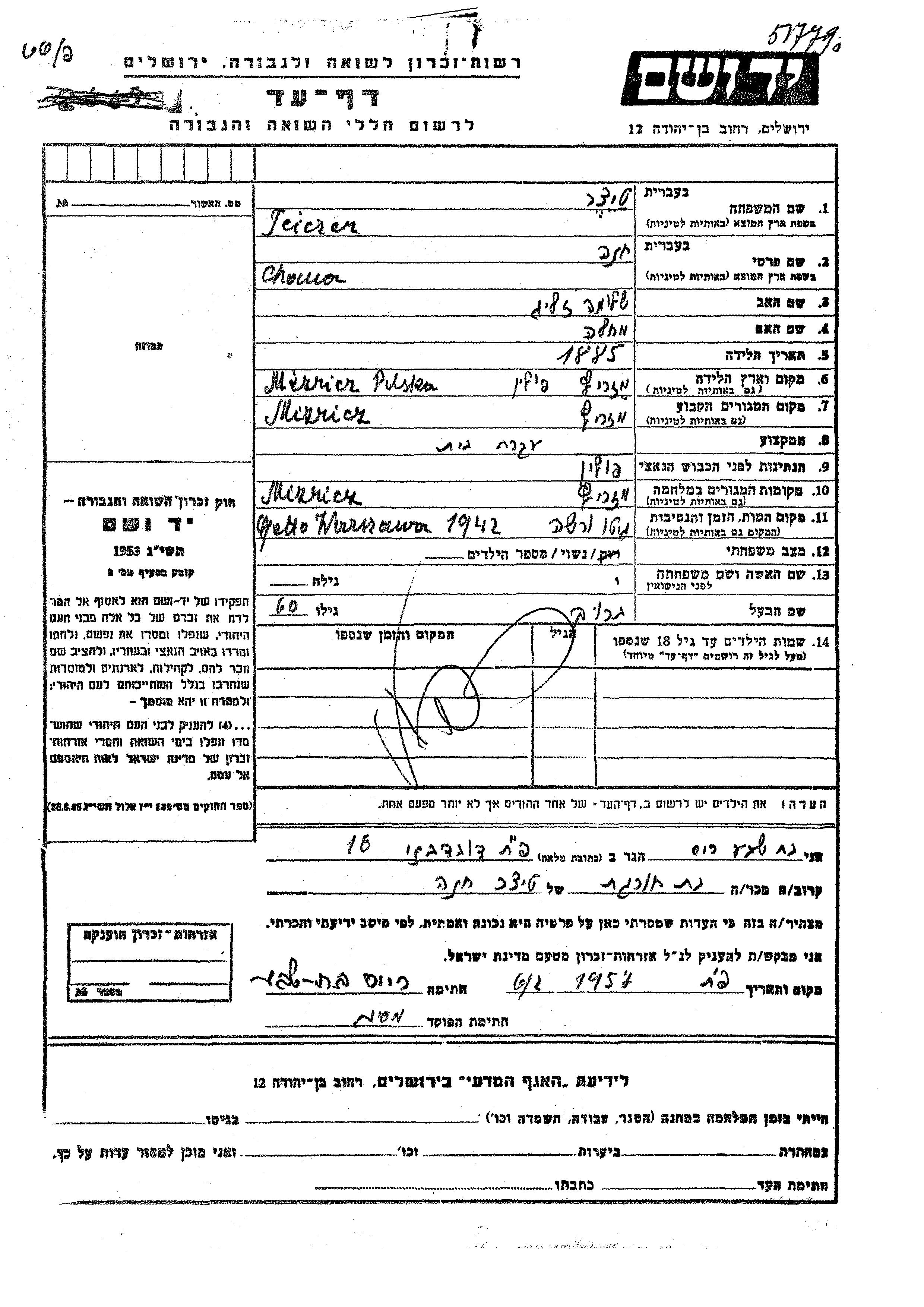 Chana Teiczer wurde im Jahr 1885 in Mizrycz, Polen geboren. Sie war die Tochter von Shlomo Zelig und Makhla. Sie war Hausfrau und mit Barukh Verheiratet. Vor dem Zweiten Weltkrieg lebte sie in Mizrycz, Polen. Während des Krieges war sie in Mizrycz, Polen.