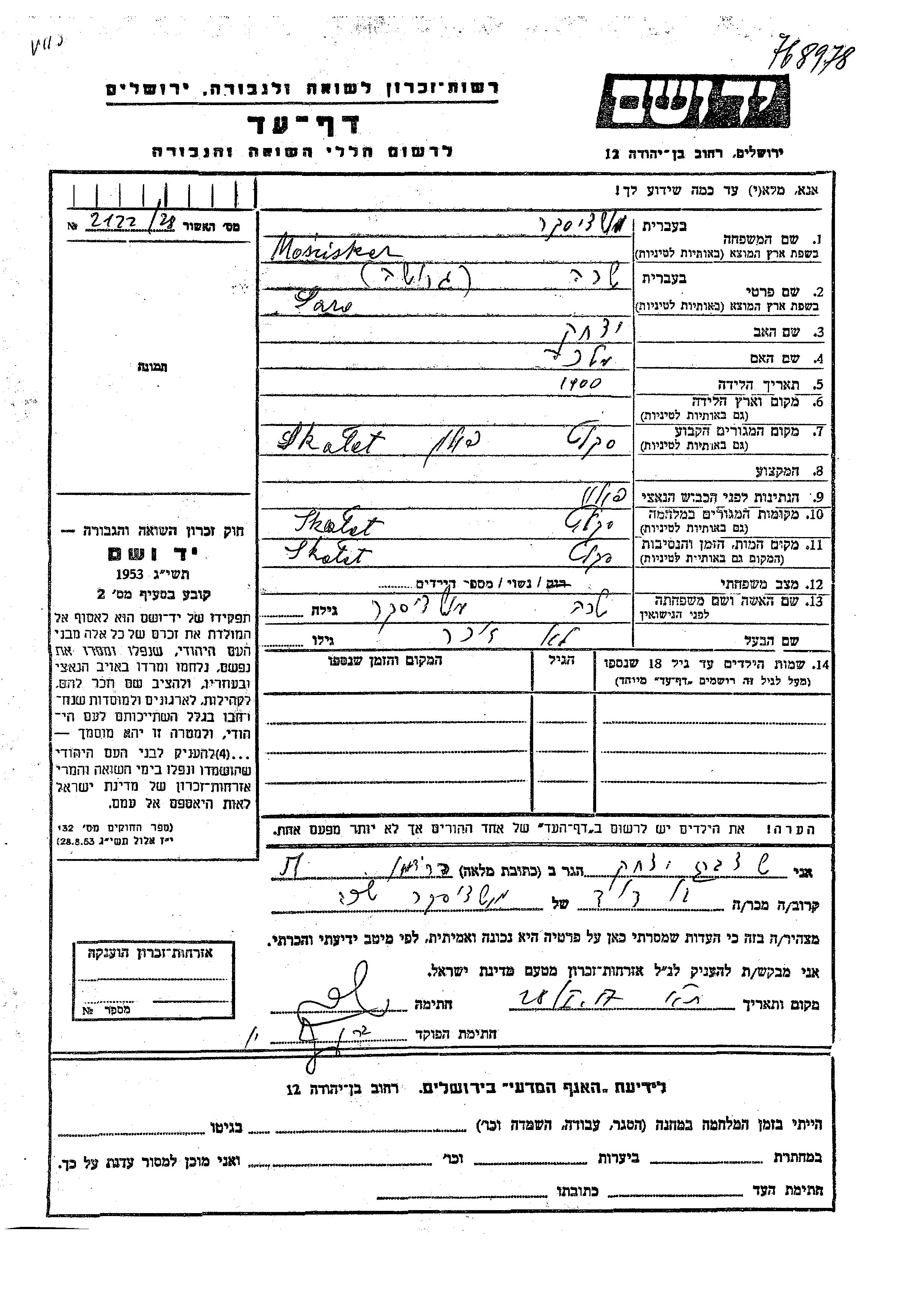 Sara Moszisker wurde im Jahr 1900 geboren. Sie war die Tochter von Yitzkhak und Malka. Sie war Geschieden. Vor dem Zweiten Weltkrieg lebte sie in Skala, Polen. Während des Krieges war sie in Skalat, Polen.