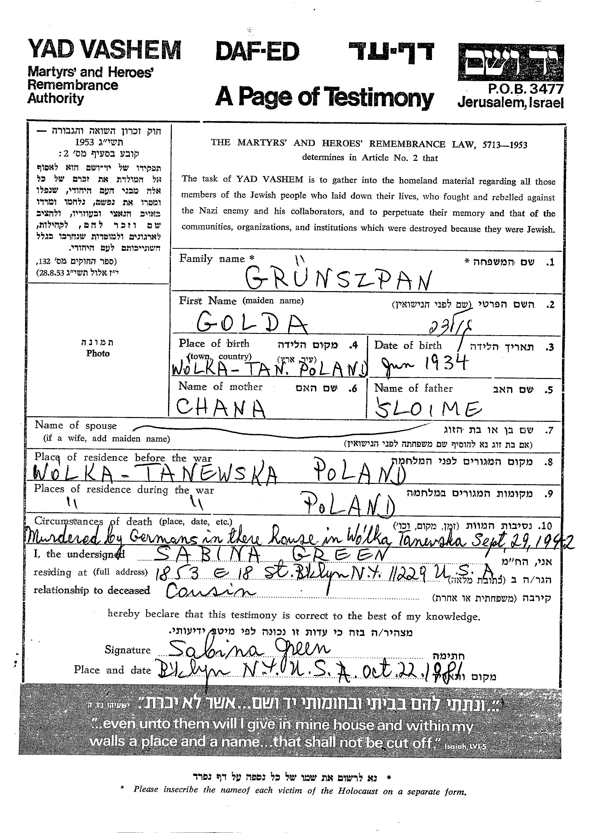 Golda Grunszpan wurde im Jahr 1934 in Wolka Tanewska, Polen geboren. Sie war die Tochter von Sloime und Chana. Sie war Ledig. Vor dem Zweiten Weltkrieg lebte sie in Wolka Tanewska, Polen. Während des Krieges war sie in Wolka Tanewska, Polen.