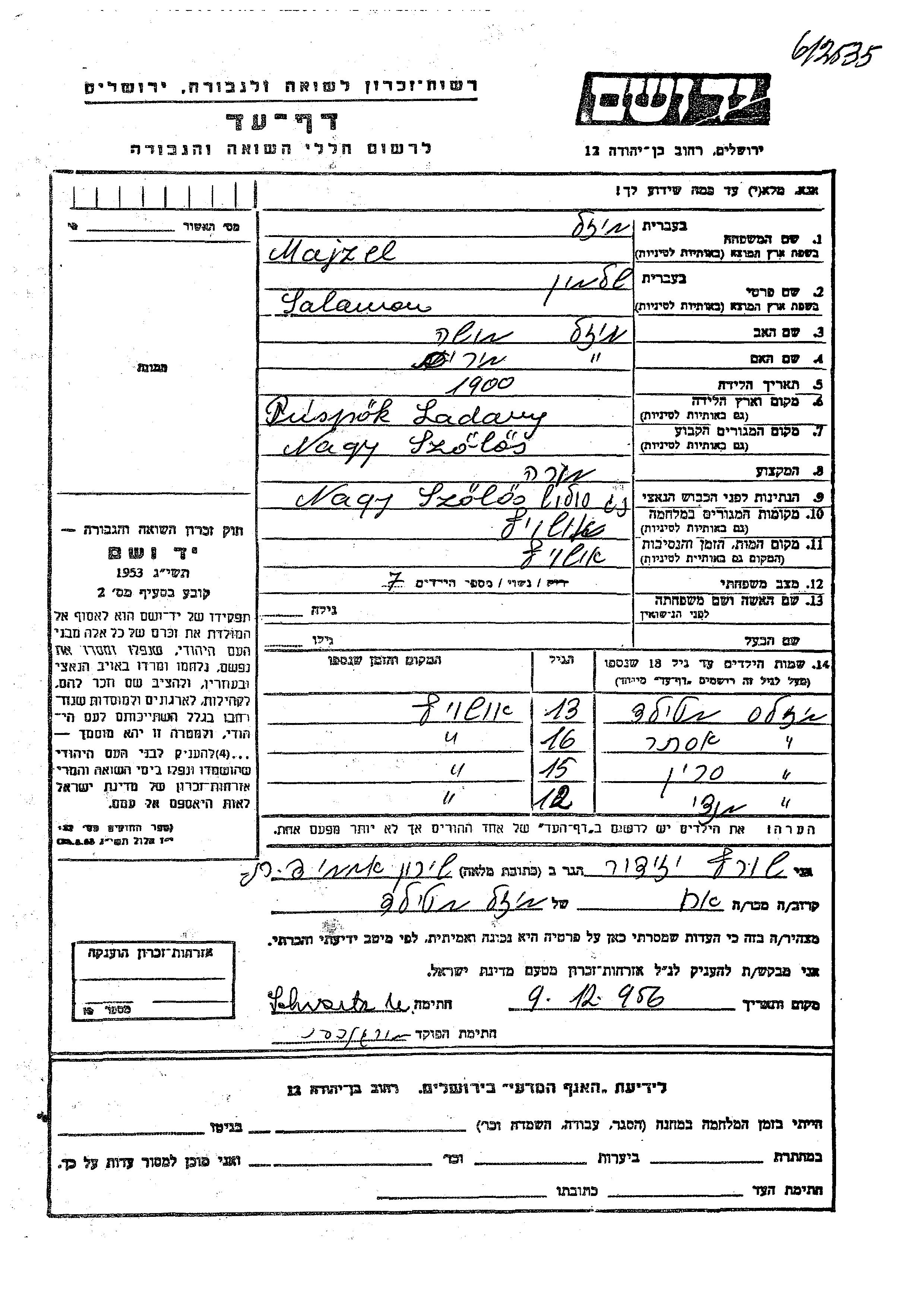 Salamon Majzel wurde im Jahr 1900 in Puspoki, Ungarn geboren. Er war der Sohn von Menashe und Miriam. Er war Lehrer/in und Verheiratet. Vor dem Zweiten Weltkrieg lebte er in Nagy Almas, Rumänien. Während des Krieges war er in Auschwitz, Polen.