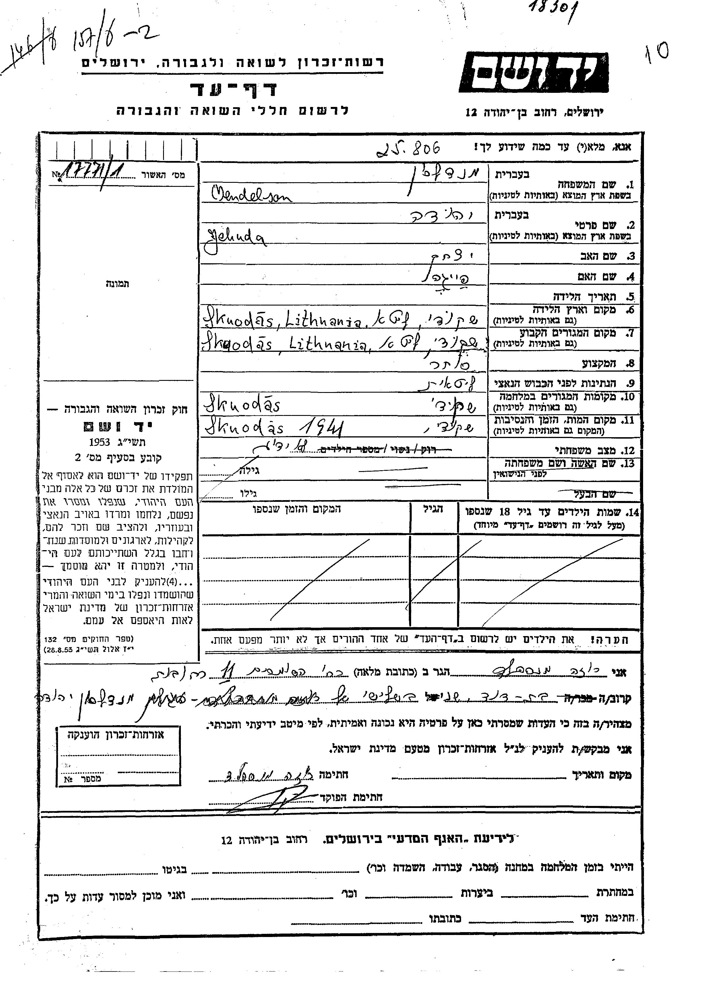 Yehuda Mendelson wurde in Skuodas, Litauen geboren. Er war der Sohn von Yitzkhak und Feiga. Er war Kaufmann/-frau. Vor dem Zweiten Weltkrieg lebte er in Skuodas, Litauen. Während des Krieges war er in Skuodas, Litauen.