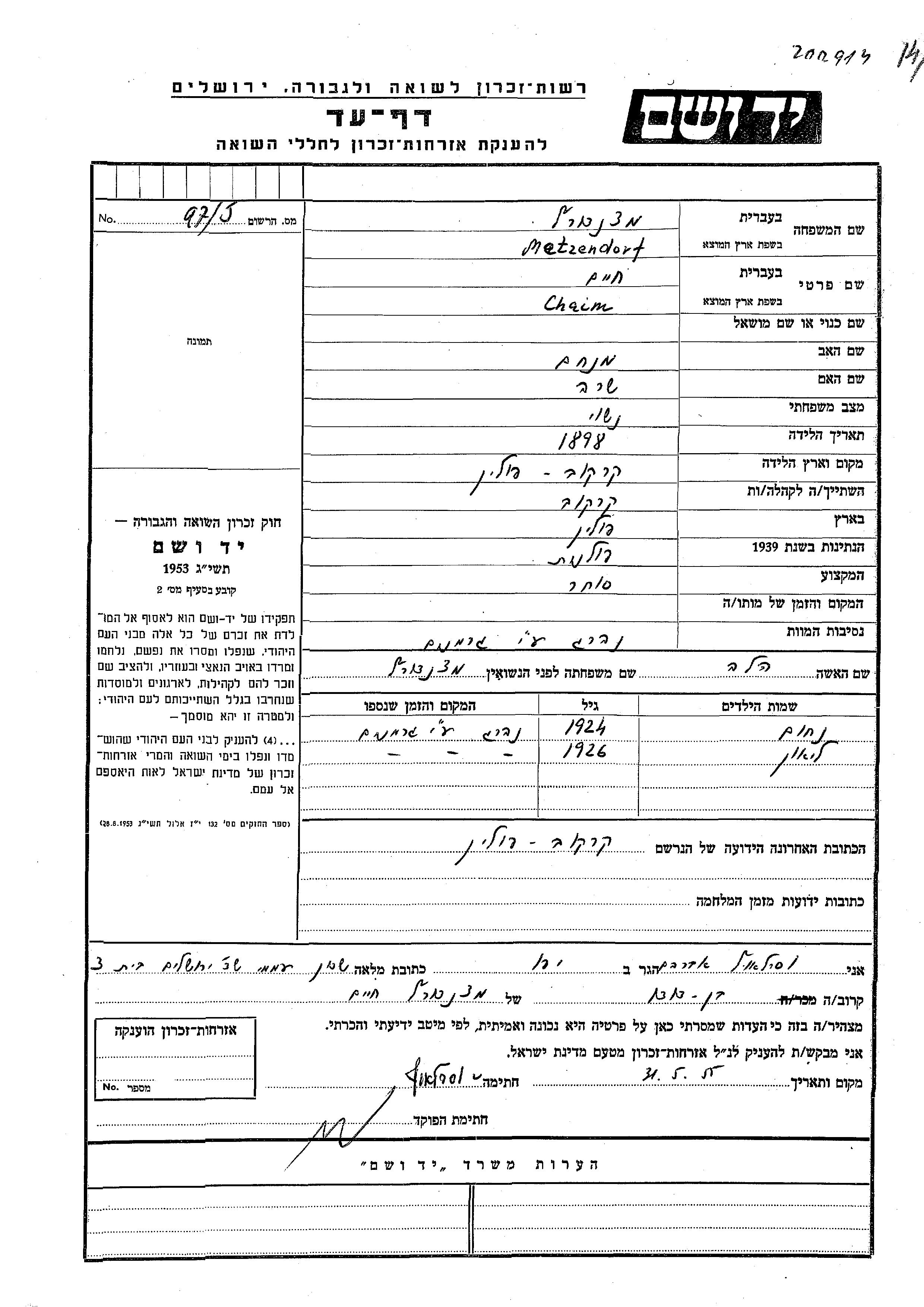 Chaim Metzendorf wurde im Jahr 1898 in Krakow, Polen geboren. Er war der Sohn von Menakhem und Sara. Er war Kaufmann/-frau und mit Hela Verheiratet. Vor dem Zweiten Weltkrieg lebte er in Krakow, Polen. Während des Krieges war er in Krakow, Polen.