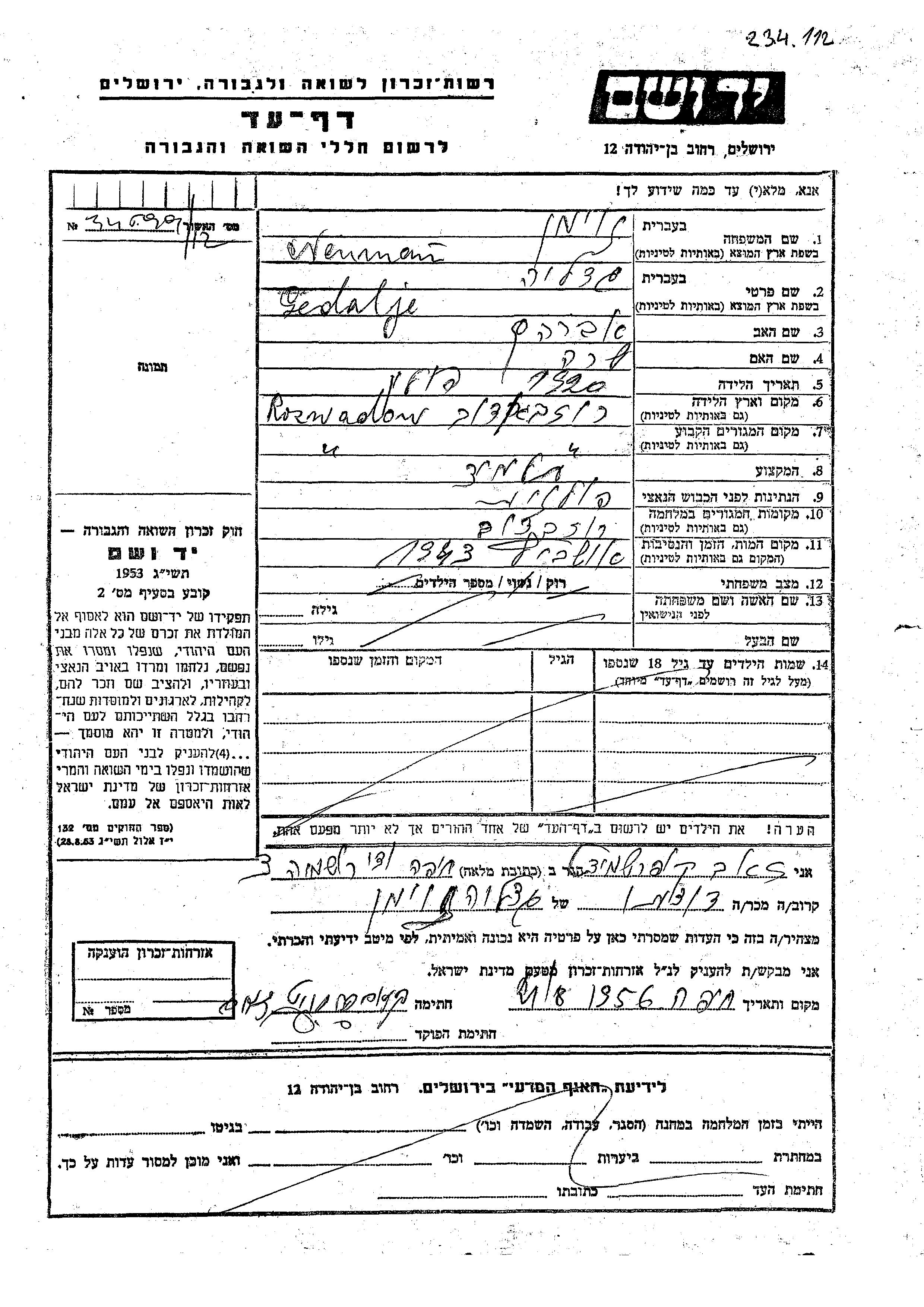 Gedalje wurde in der Schoah ermordet. Todesort: Auschwitz, Polen im Jahr 1943.