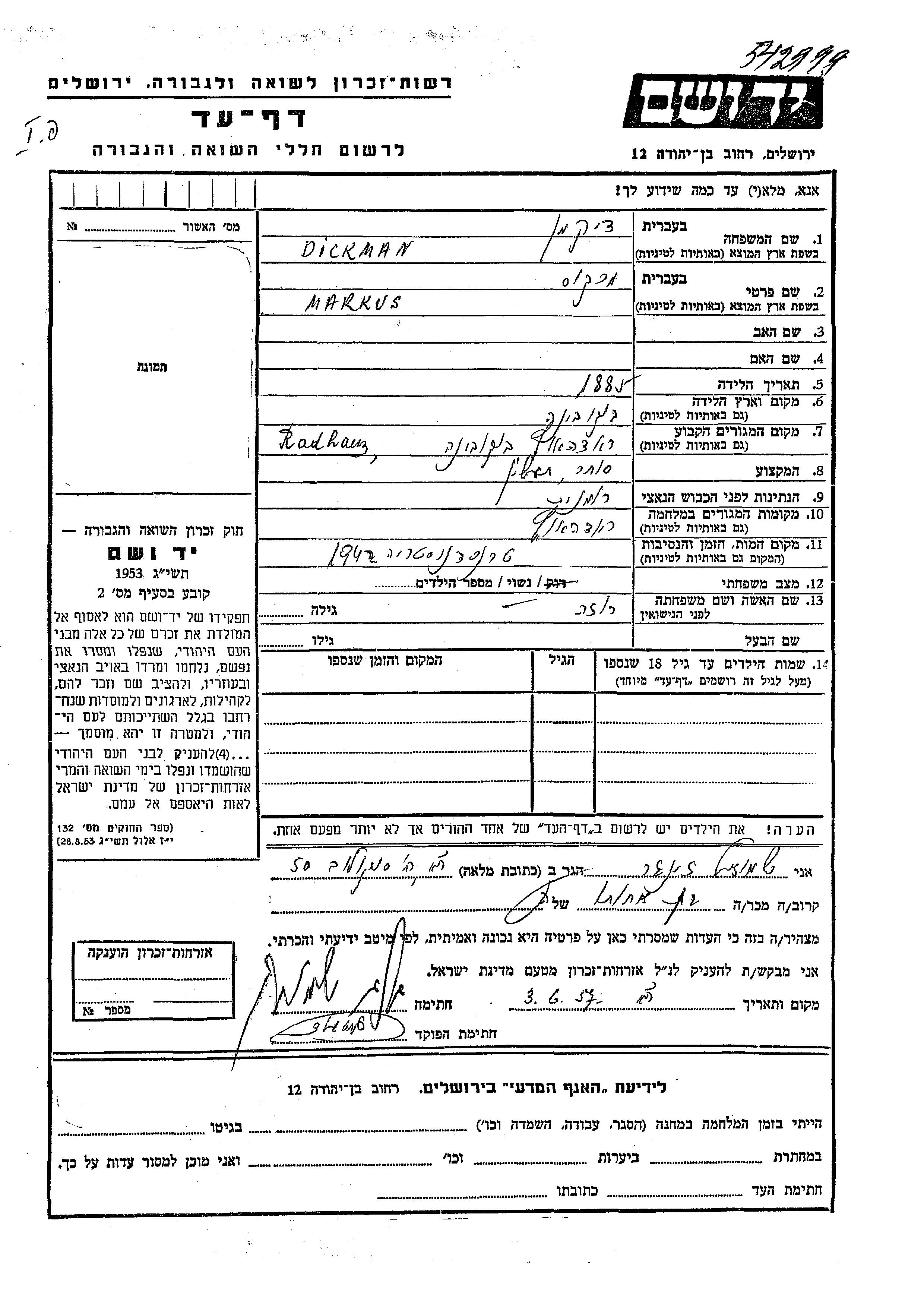 Markus Dickman wurde im Jahr 1885 in Bukovina, Rumänien geboren. Er war Kaufmann/-frau und mit Roza Verheiratet. Vor dem Zweiten Weltkrieg lebte er in Radauti, Rumänien. Während des Krieges war er in Radauti, Rumänien.
