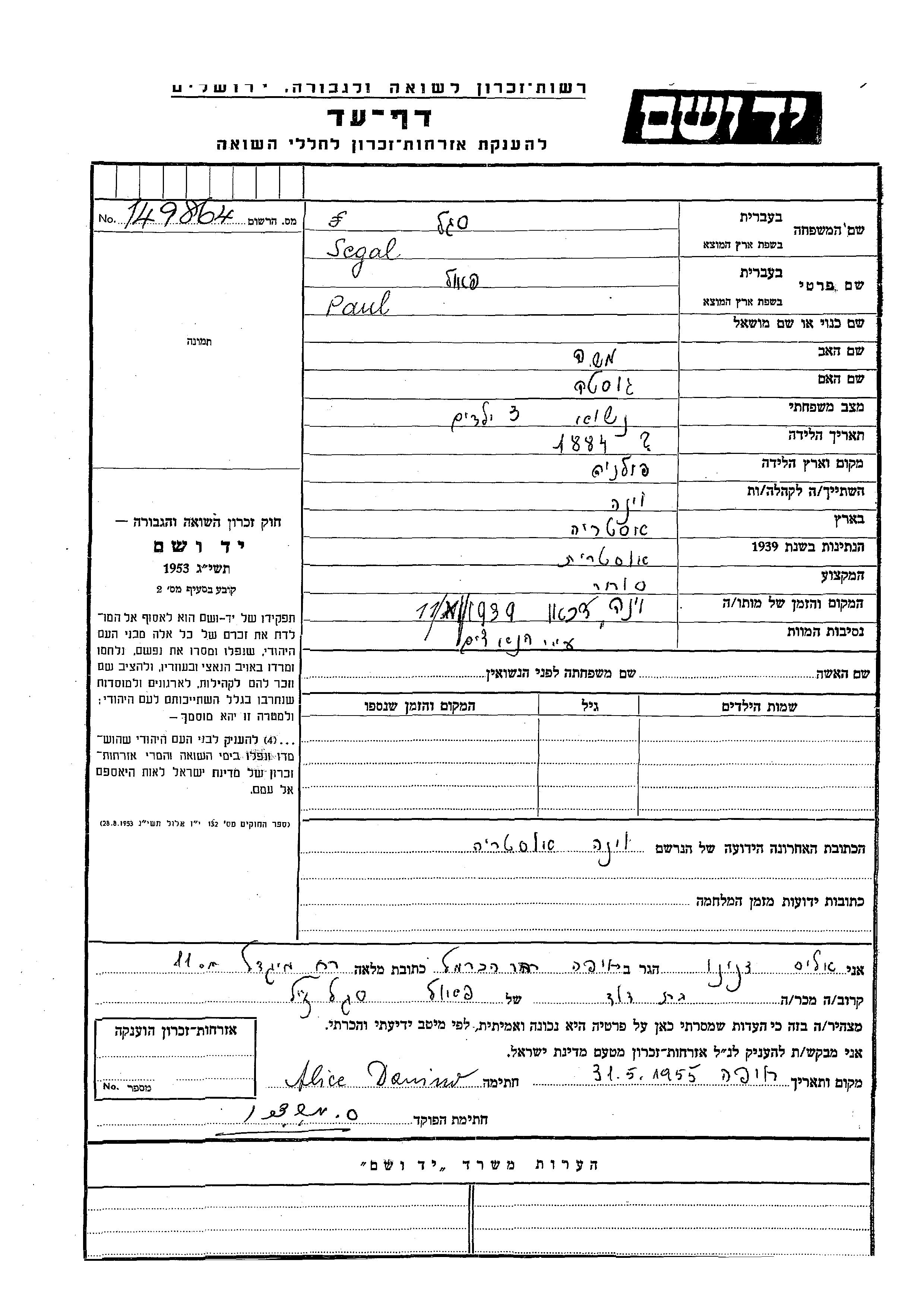 Paul wurde in der Schoah ermordet. Todesort: Wien, Österreich im Jahr 11/10/1939.